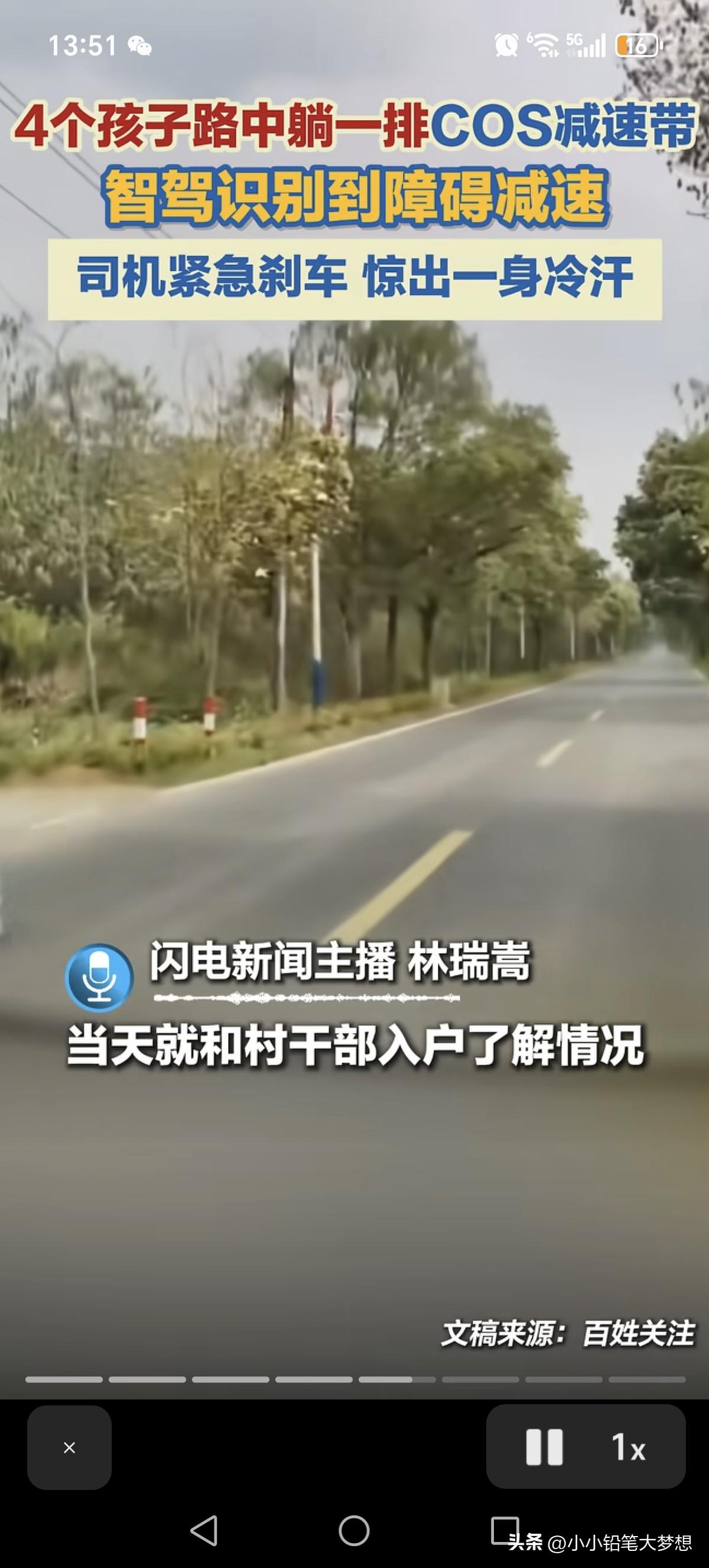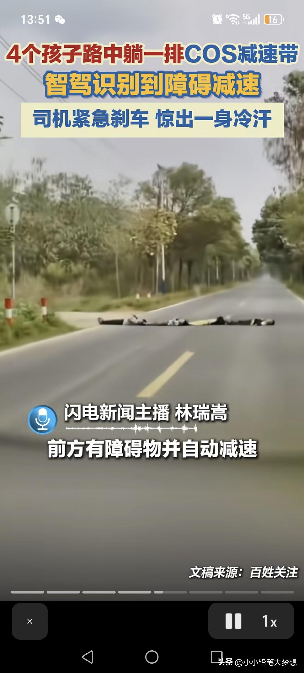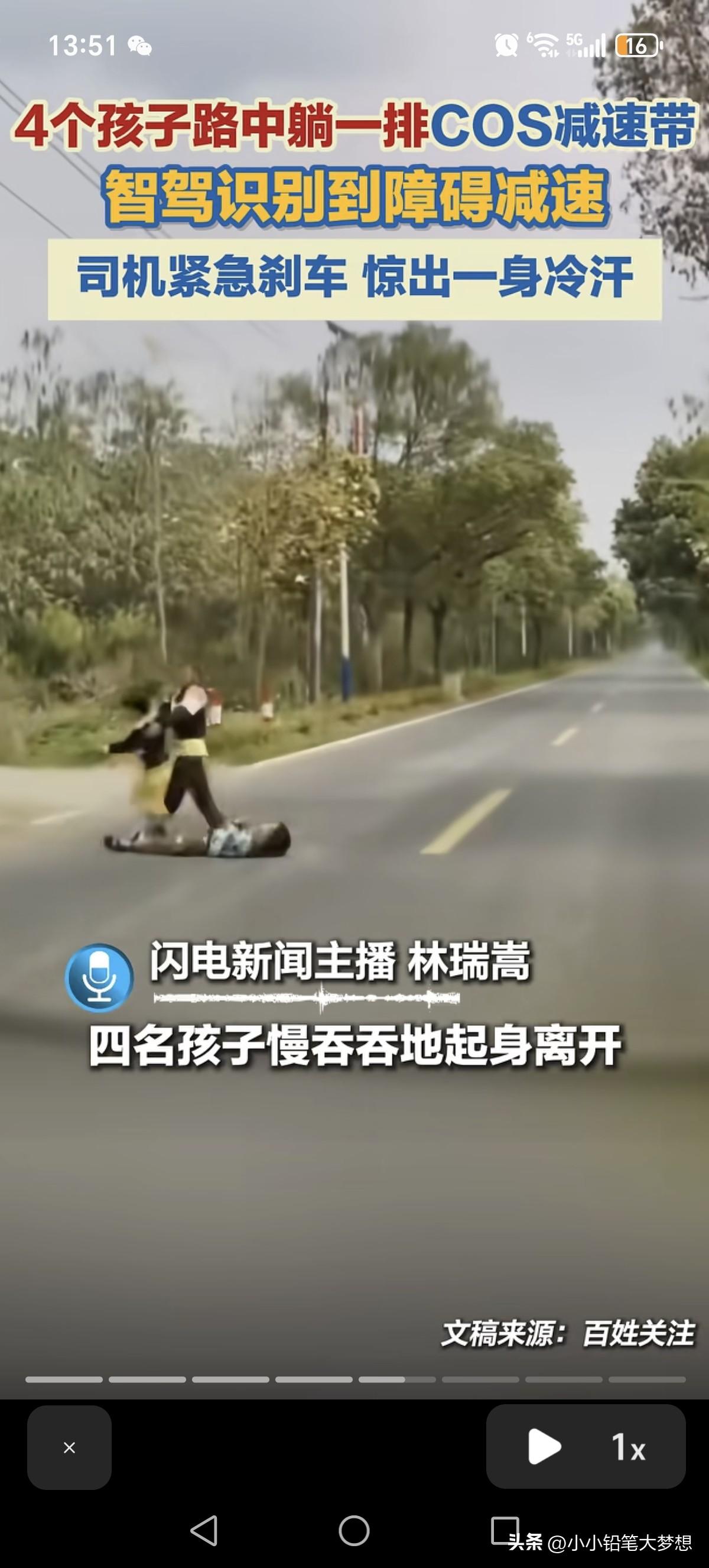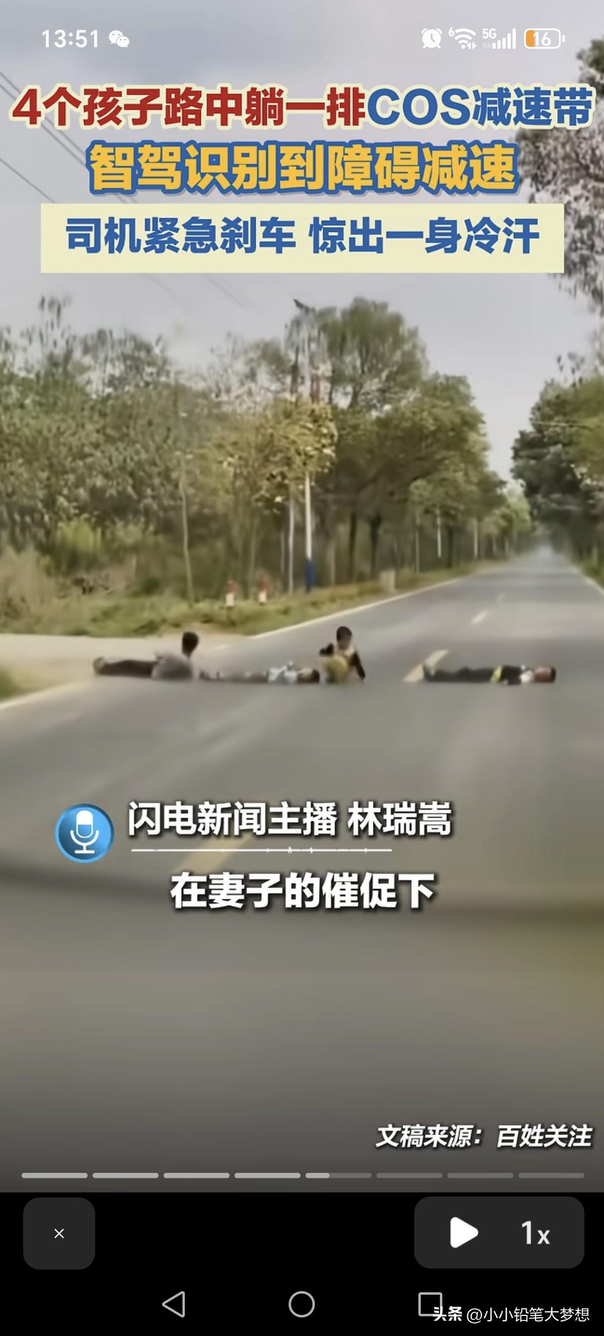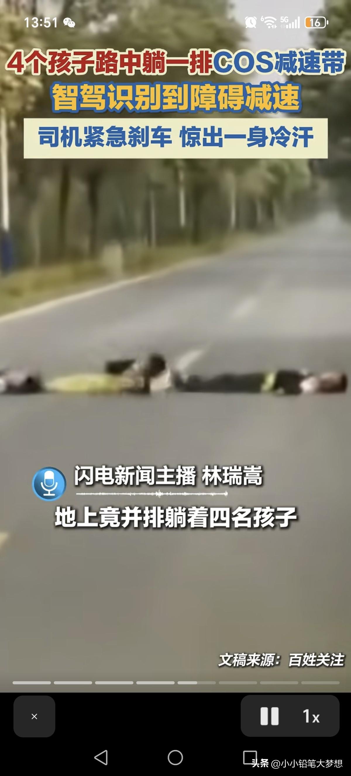 牛批,居然还有人cos减速带,这不是玩命嘛!近日,广东英德,四个孩子在马路上cos减速带,一名司机开着智驾行驶在这个县道上,智驾提示前面有障碍物,当时司机不以为然,他以为是黑色的塑料袋想着冲过去,但是他副驾上的妻子不放心,让他主动接管汽车,等靠近的时候,才发现路上躺了四个孩子,他紧急把车踩停,然后吓出了一身冷汗。 行车记录仪记录了这一幕,从视频中可以看到,车辆还没靠近的时候,我远远的看着前面真的是误以为是一条减速带,等到车靠近的时候,就看见了四个黑色的头,司机就紧急刹停了,随后就传出了很刺耳的刹车声音,而这四个孩子听到刹车的声音之后,纷纷慢吞吞地爬了起来,然后开溜了。 从他们穿着中可以辨别他们是故意的,他们特意穿着黑黄颜色,直溜溜的排了一排。 说实话,在汽车没有靠近的时候,我真的以为那是一条减速带,这些孩子齐刷刷的躺在马路上,这真的是拿生命开玩笑啊!幸好司机的老婆留了个心眼,主动提醒自己的丈夫,才没酿成事故! 司机后来把这个视频发布在网上,视频引起了热议,当地的镇政府称已经联合村干部了解了情况,并且针对性的入户对孩子进行了安全教育。 不知道这是谁家的孩子,家长回去一定要狠狠的揍几下,如果我是这个司机,我当时就会拦住这几个孩子,然后立刻报警,让警察把孩子送到派出所,再让这些家长把孩子领回家去,这家长如果再不管教这孩子,以后肯定出大事,这可不是开玩笑啊,如果视频车没有停下来,这这样碾过去的话,这后果不敢设想,到时候做家长的就别来讹人了!