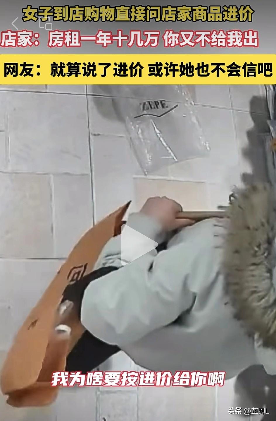 顾客买衣服直接问进价,老板一句话怼懵!网友:一个敢问,一个敢说! 逛街买东西,有人喜欢砍价,但你见过直接问进价的吗? 近日,一段购物时候的对话火了。一女子买东西时,张口就问店家:这货进价多少?还说她买东西,别人都给她进价! 老板也是个实在人,一点没惯着,直接回:“进价多少跟你有什么关系?我房租一年十几万,你又不给我出!” 一句话,把女子问得哑口无言。 这事传到网上,网友评论很真实: 一个太年轻,说话太直接,有点轻浮; 一个太实在,接话太耿直,一点不留余地。 其实开店的都懂,卖的不只是商品,还有房租、水电、人工和时间。买东西可以砍价,但一上来就问进价,确实有点让老板为难。 可以讲价,可以比价,但别一上来就戳人成本,谁做生意都不容易。 大家都要互相理解,生意不是只赚差价,背后全是成本。 你买东西时,会直接问商家进价吗?来聊聊! 素材来源:洪观新闻,侵联删!