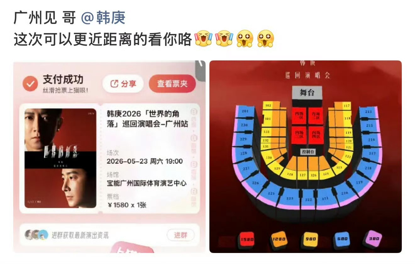 韩庚演唱会广州站售罄韩庚真的太火了🔥「世界的角落」巡演首场一开票就秒空,实力真不是说说而已!5月23日羊城相见,终于能现场听庚哥唱歌,沉浸式感受他的舞台魅力,已经开始狠狠期待这场超治愈的音乐约会啦~韩庚世界的角落巡演