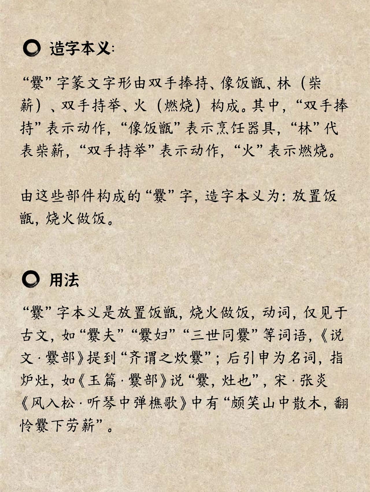 古人是怎么把“做饭”这件大事,塞进一个字里的? 今天学一个汉字界的“满汉全席”——“爨”(cuàn)!光看它30多画的笔画,是不是就感觉头大了?别怕,搞清楚造字本义后一下就觉得简单了。几千年前的古人,他们要造一个表示“烧火做饭”的字。于是,他们把整个过程都画了下来: 最上面是锅(甑)和灶台(冖),下面两只手(廾)正把木柴(林)塞进灶里,点燃火(火)🔥。从放锅到添柴再到点火,一个完整的烹饪流程,一气呵成,全都在这一个字里了!你看它的古字形是不是超级形象? 许书里就讲:“齐谓之炊爨”,意思是在古代的齐国,人们管“烧火做饭”就叫“爨” ,就像一个古老的方言词,流传至今。 ✨ 虽然我们现在很少写这个字了,但它还活在一些不为我们常用的文化里,比如成语“分居异爨”,就是指兄弟成家后,分开起炉灶过日子。有灶火的地方,才有人间烟火气呀!🍚