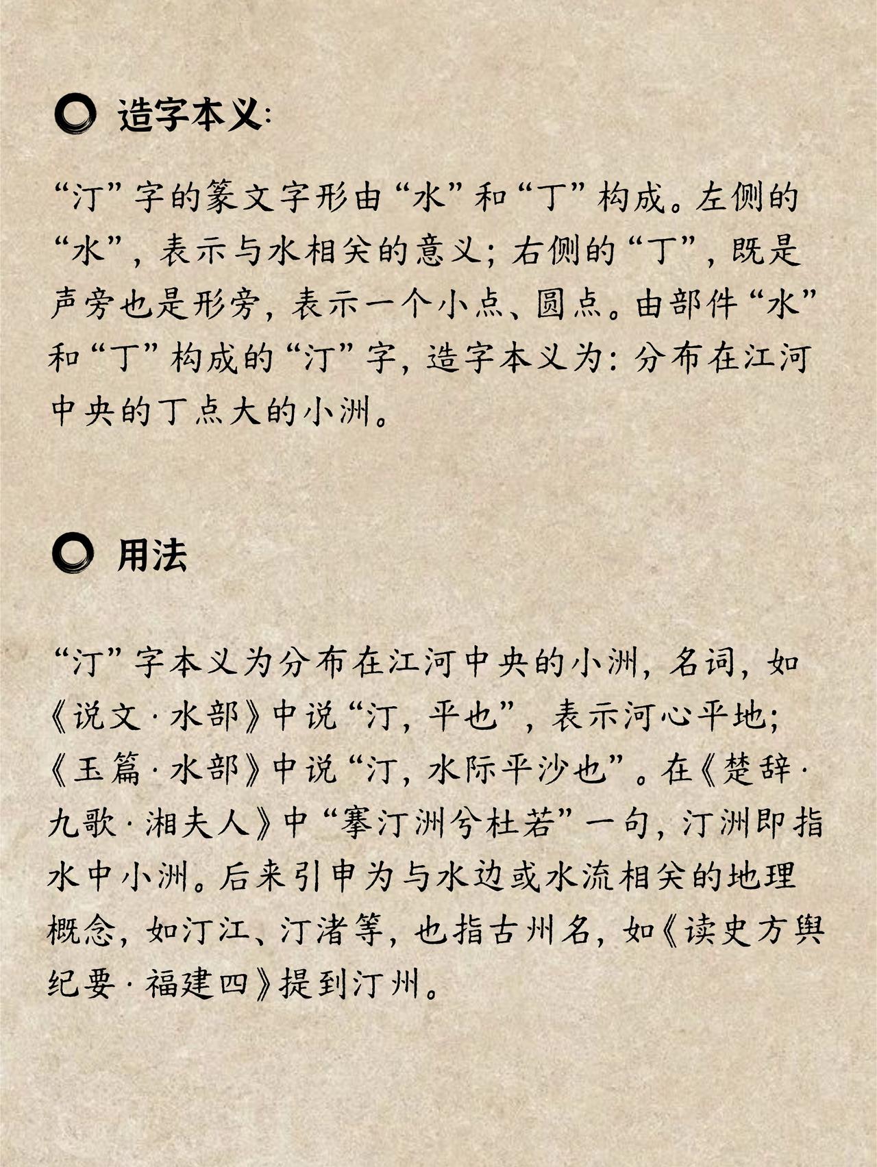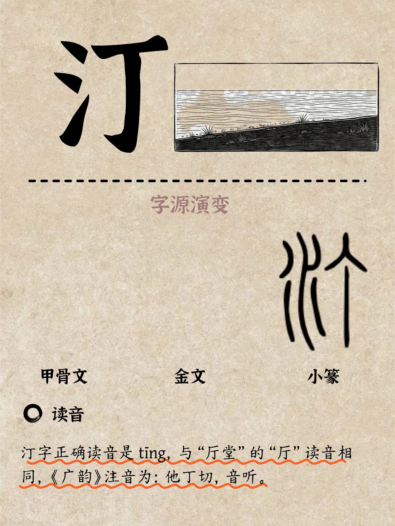 ✨ “汀”字,自带江南烟雨气息,正确的读音为tīng,很容易错读🏞️。古人划着小船,行驶在宽阔平静的江面上。他们看到江心有一片小小的、平坦的沙洲,该怎么表达呢?聪明的先人,就创造除了“汀”这个字。左边的“氵”代表江河湖海,右边的“丁”除了表音,更像是在广阔的水面上,轻轻点下的一个标记,代表那丁点大的陆地,画面感很强🥰 所以,汀字的本义就是水边或水中的平地。许慎《说文解字》里说:“汀,平也”,意思就是水边的平坦陆地。💡 屈原在《九歌·湘夫人》中写道:“搴汀洲兮杜若”,写的就是在水边的小洲上,采摘杜若香草的浪漫场景。一个“汀”字,瞬间把我们带到了那烟波浩渺的湘水之上。 🤔 你的家乡有带“汀”字的地名吗?你能读准这个字的音吗?