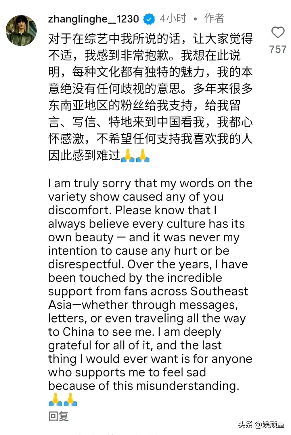 艺人也不好做了! 张凌赫因为综艺节目中一句话,发文道歉! 张凌赫道歉冤不冤很难定