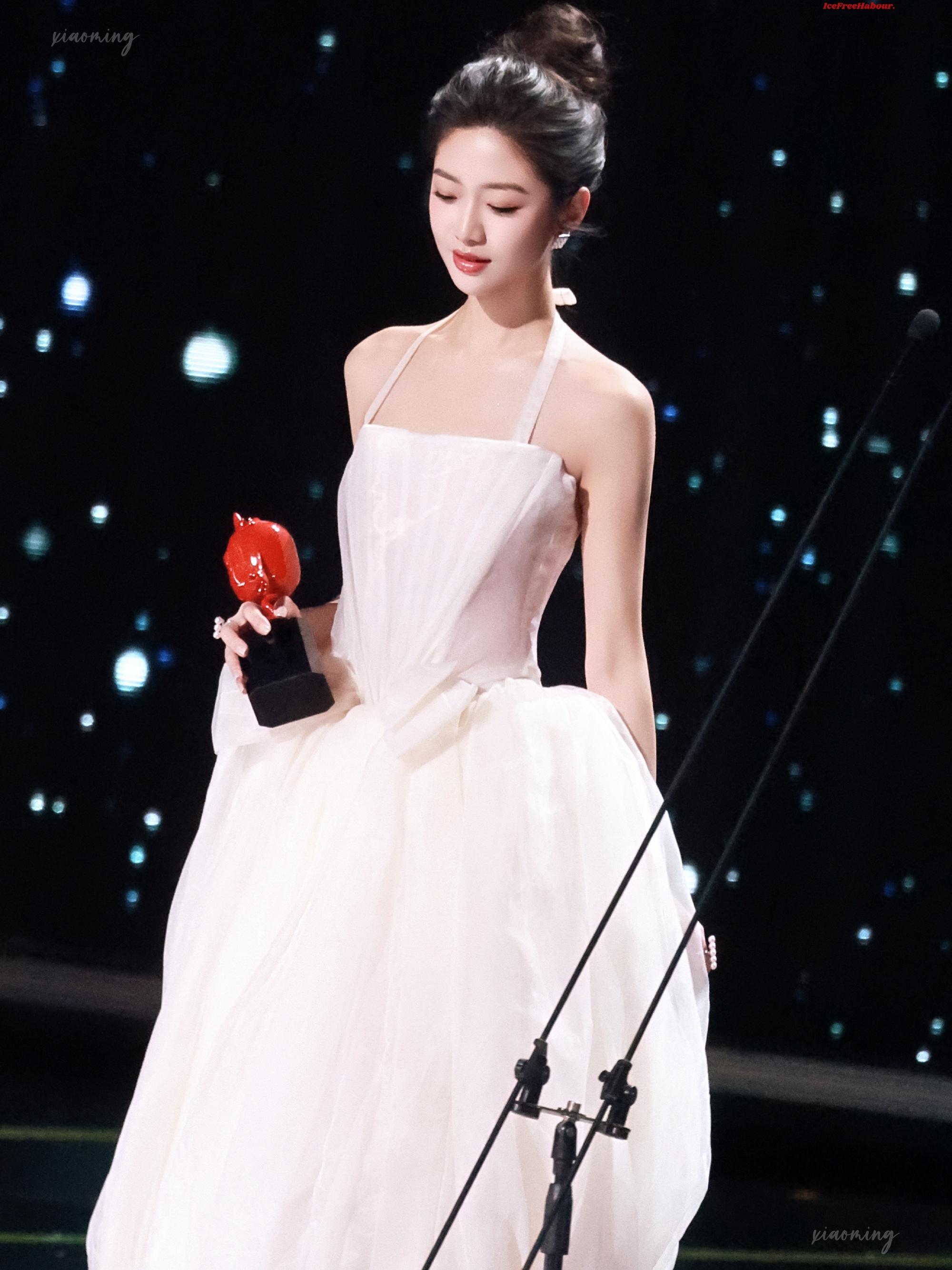 向涵之米白挂脖花苞裙,上身修身下身蓬松,设计感十足刚刚好