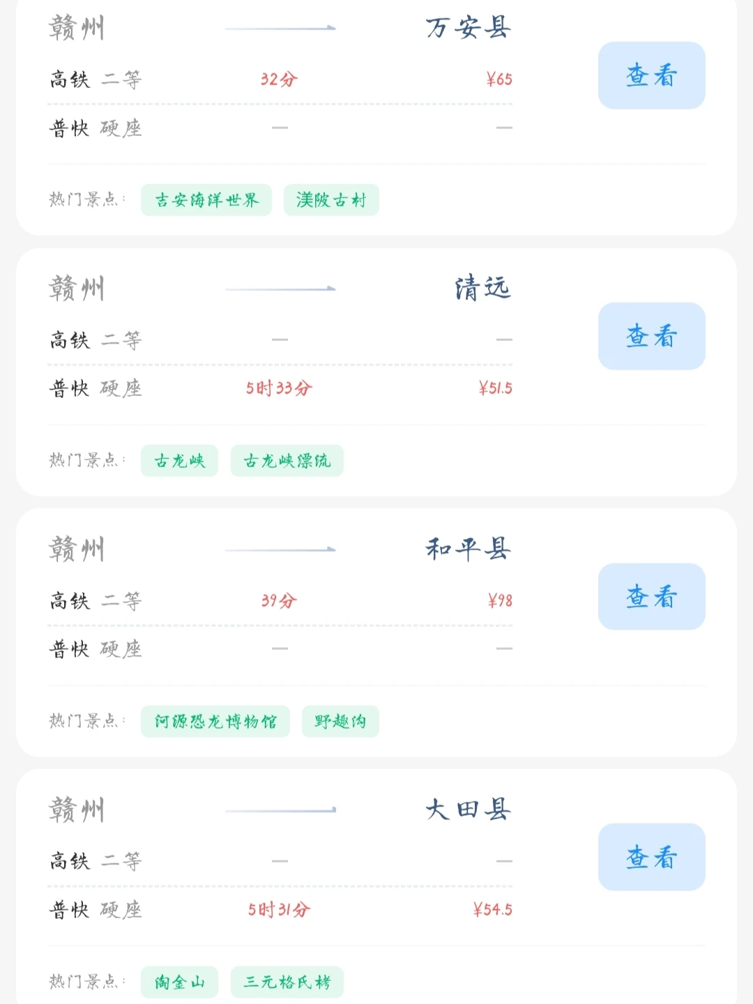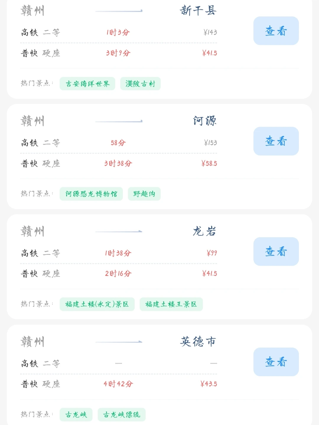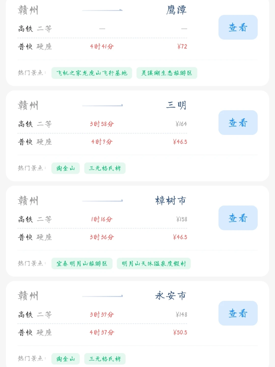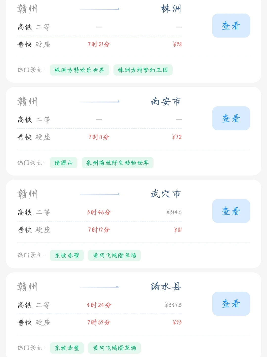 赣州的老乡们看过来! 帮大家整理好了赣州出发100块的火车票就能去的旅游城市 赣州的打工人和学生党可以看看里面有没有自己想去的城市 可以挑个周末或者节假日出去玩呀[色色R]