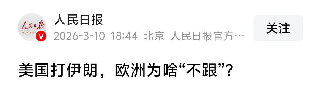人民日报:美国打伊朗,欧洲为啥“不跟”? 我说几句:1、美国总统特朗普这一年多时间伤透了欧洲的心;2、美以开战仓促且因保密需要未能与欧洲进行有效沟通;3、特朗普可能以为会复制委内瑞拉行动结果;4、中东是欧洲能源命脉。 你认为还可能有什么原因?
