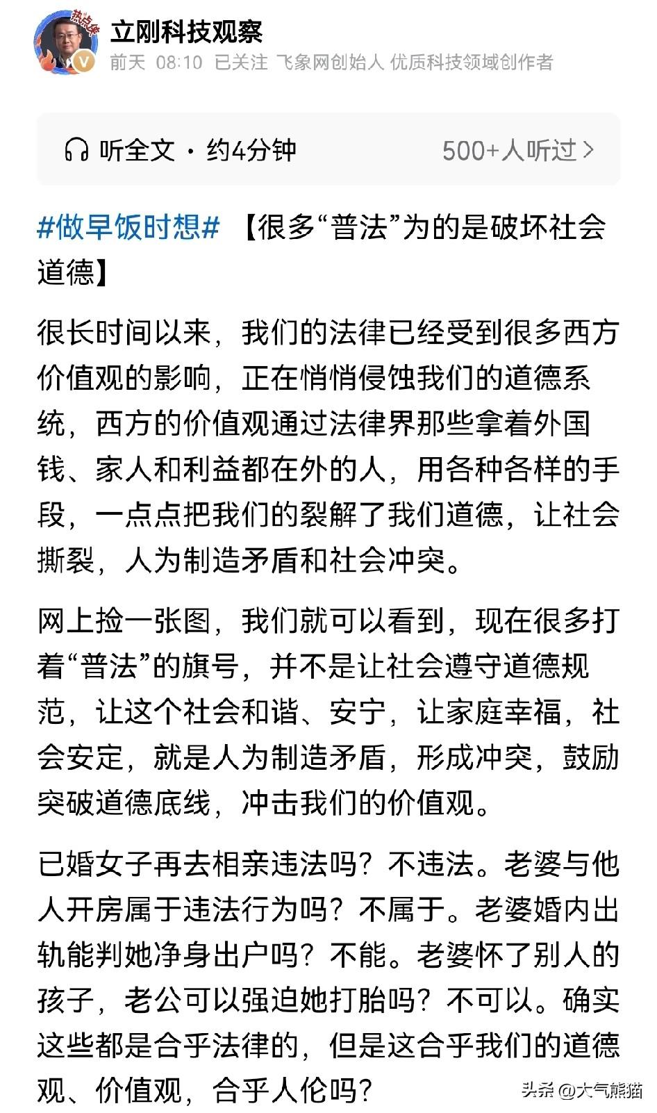 项立刚公开发表文章说:很多“普法”为的是破坏社会道德,确实有点儿语出惊人。 他认为,从西方硬搬过来的法律,对于我们形成了上千年的道德体制产生了巨大的冲击,比如婚内出轨不违法,婚内出轨也不能净身出户,就算是怀孕或者是生下别人的孩子,也必须要抚养,这确实颠覆了人们的认知,在以前确实是不敢想象的。 相当长的一段时间内,各朝各代的社会体系是通过有限的法律和普遍道德共同支撑的,但现在引入西方法律之后,大家所认同的道德观念全部被冲垮,这也确实应该引起关注。 毕竟社会的治理不能只有法律,道德同样是管理坚实的基石。