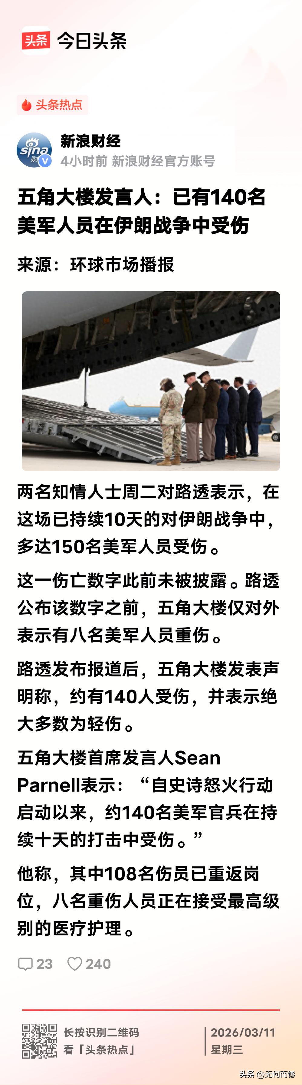 美国对伊朗发动的战争,美军除了已经阵亡的士兵之外,又有多少士兵受伤呢?据五角大楼发言人最新的说法,到目前已经有140名美军士兵受伤,这是他们自己公开承认的数字,因此真实受伤的数字,就不可能小于这个数字!