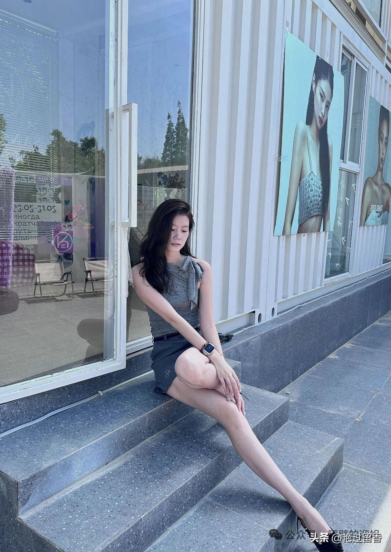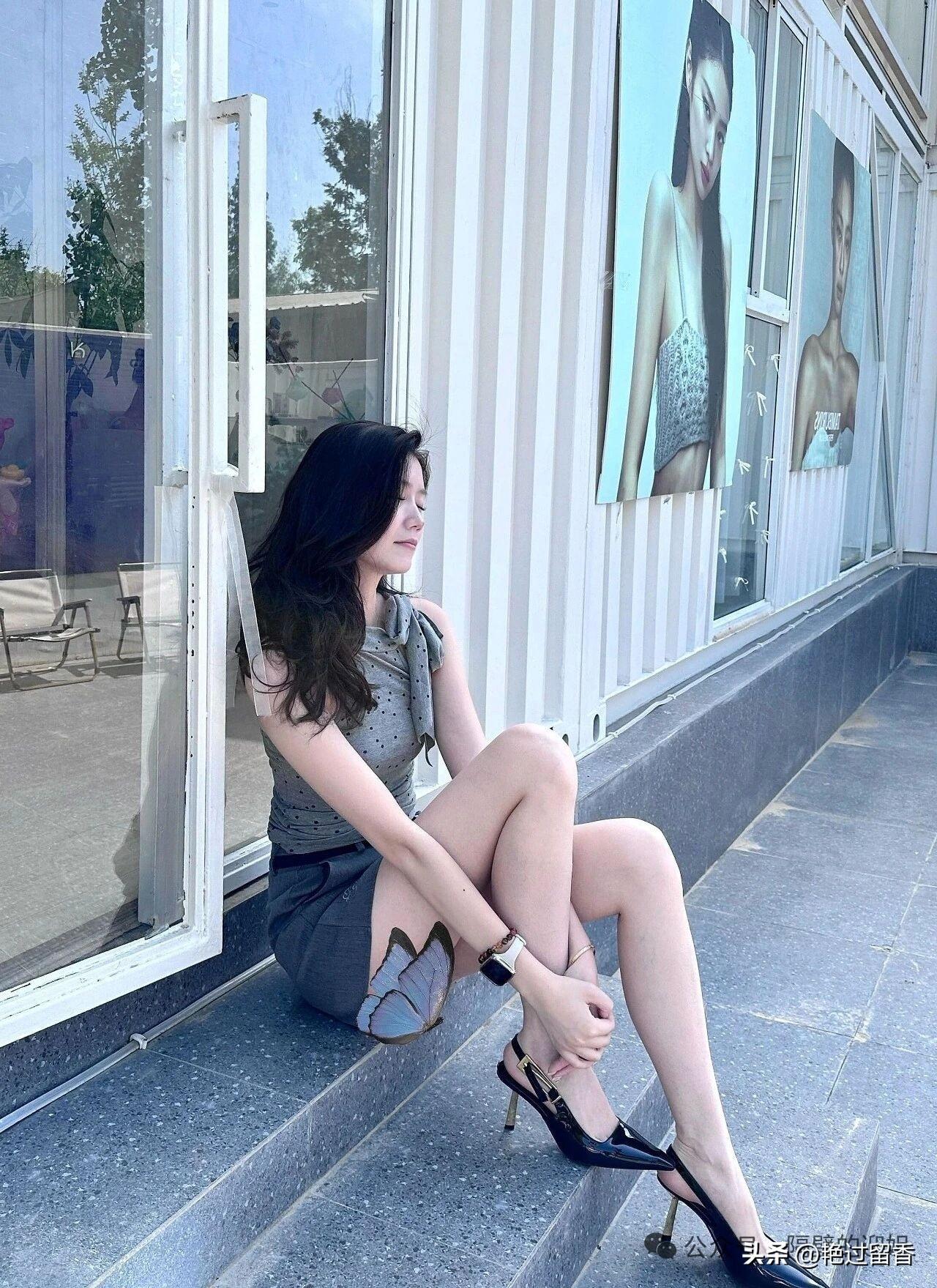 都市女孩的时尚穿搭,优雅地坐在台阶上。女人穿裙子配什么鞋显得更有品味?