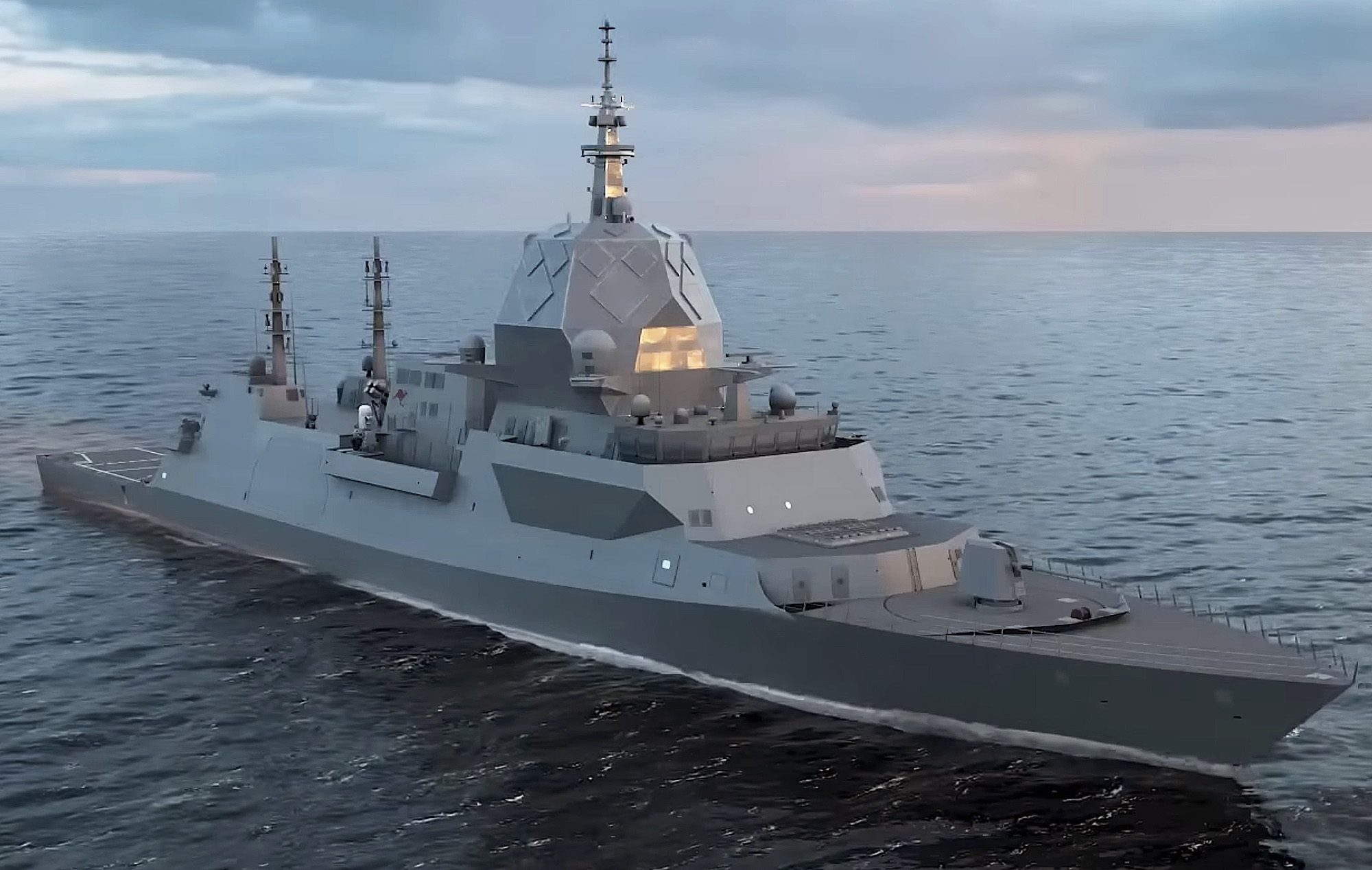 澳大利亚猎人级护卫舰的最新渲染图。6个L波段阵列、12个S波段和6个X波段照明器