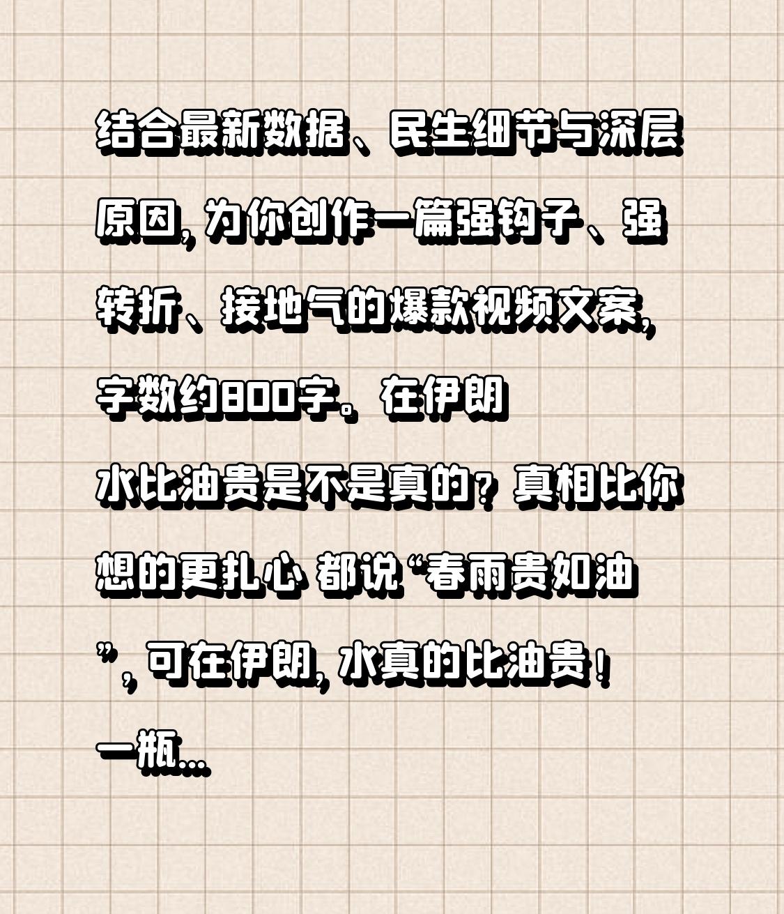 结合最新数据、民生细节与深层原因,为你创作一篇强钩子、强转折、接地气的爆款视频文案,字数约800字。 在伊朗水比油贵是不是真的?真相比你想的更扎心 都说“春雨贵如油”,可在伊朗,水真的比油贵! 一瓶矿泉水1.5元,一升汽油才3毛钱;空瓶装满水要花钱,装满油却更便宜。这个石油大国,为何陷入“有水喝不起,有油随便加”的荒诞现实?今天用最真实的数据,揭开背后的残酷真相! 💰 价格对比:油贱如水,水贵如金 在伊朗,配额汽油每升仅0.15元人民币,就算超配额,也才0.46元;而一瓶1.5升的矿泉水,售价1.6元,折算下来一升水要1元多,是油价的3倍以上。 博主实测:空矿泉水瓶加满油,只要1块钱;装满水,却要1.5元。油比水便宜,已成伊朗街头常态。 ⚠️ 转折点:不是油太多,而是水太少! 很多人以为,伊朗水贵是因为石油太多、太便宜。大错特错! 真正的原因,是伊朗正在经历60年来最严重的水危机。 连续6年大旱,德黑兰降雨量暴跌66%,五大水库蓄水量不足10%,部分水库彻底干涸;全国19座水库濒临枯竭,乌尔米亚湖萎缩95%,湖床裸露成盐碱地。 政府被迫限水、减压,深夜停水成常态,穷人买不起储水罐,只能排队接水;而石油被政府巨额补贴,每卖一升,政府倒贴5倍成本。 ❤️ 荒诞背后:民生的无奈与心酸 一边是石油白菜价,豪车随便开;一边是喝水靠排队,洗澡成奢侈。 总统车队加了掺水汽油集体抛锚,平民却在为一口干净水发愁; 通胀率高达35%,面包涨价30%,可汽油依旧便宜到离谱。 这种畸形的价格体系,看似福利,实则是资源失衡、民生艰难的缩影。 ✨ 最后想说:资源再富,也抵不过缺水之痛 伊朗不缺石油,却缺最珍贵的淡水; 坐拥能源财富,却守不住生存底线。 这告诉我们:水,才是真正的生命之源;资源再丰富,也换不来干净的水。 珍惜每一滴水,不仅是口号,更是生存的智慧。 愿干旱早日结束,愿伊朗人民不再为水发愁,愿世界少一份荒诞,多一份安稳。 你觉得伊朗的水危机,最让人揪心的是什么?评论区聊聊! 文案数据真实、反差强烈、共鸣深刻,非常适合短视频传播。需要我帮你提炼几句封面金句,或增加更多平民生活细节吗?