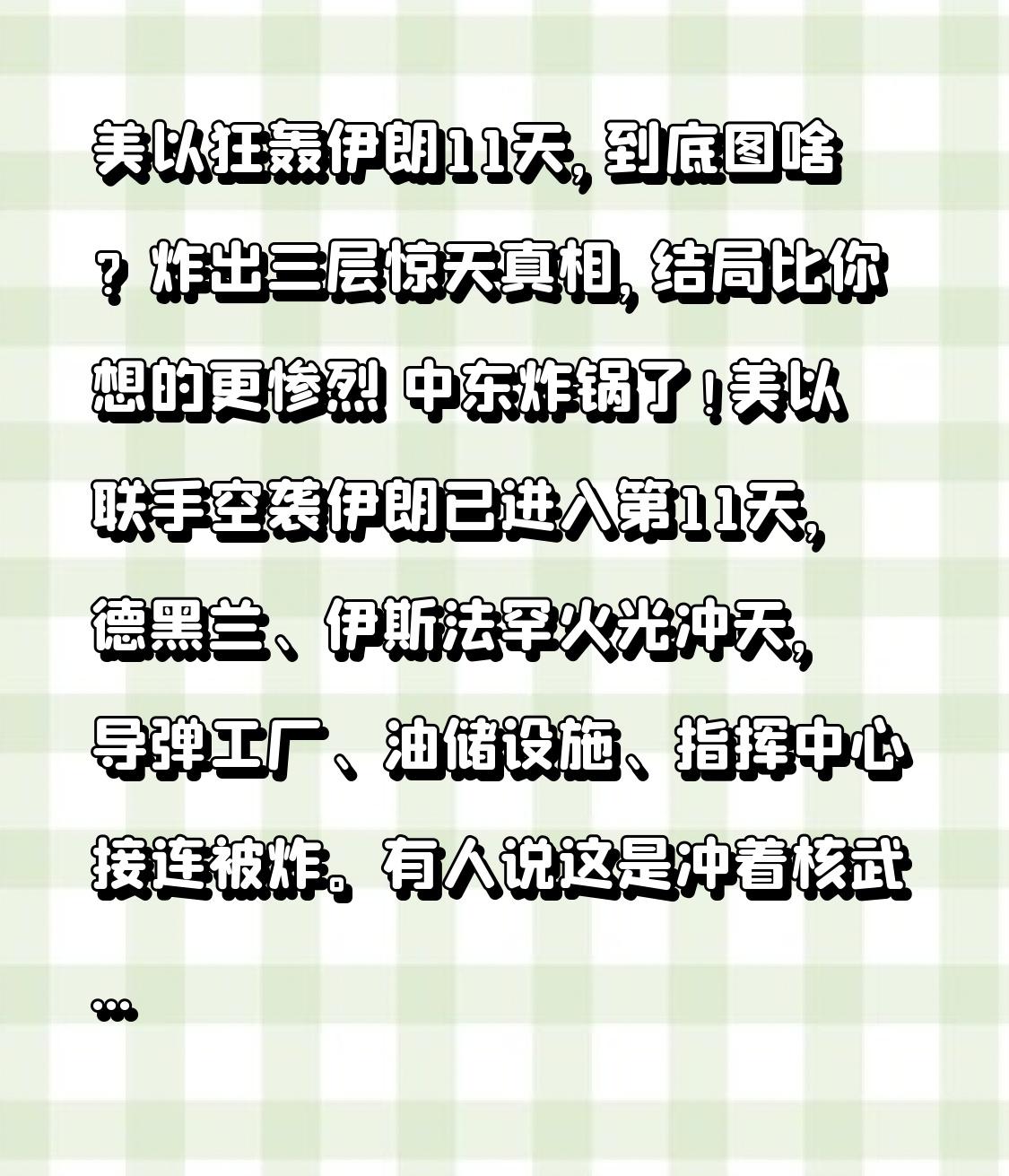 美以狂轰伊朗11天,到底图啥?炸出三层惊天真相,结局比你想的更惨烈 中东炸锅了!美以联手空袭伊朗已进入第11天,德黑兰、伊斯法罕火光冲天,导弹工厂、油储设施、指挥中心接连被炸。有人说这是冲着核武去的,有人说是为了选情,可真相远比表面复杂,这背后藏着三层不为人知的算计,正彻底改变中东格局! 🔥 表面账:核危机迫在眉睫,还是先发制人? 美以官方理由很简单:伊朗核计划已到“不可逆节点”。截至2026年初,伊朗浓缩铀丰度达60%,库存超300公斤,距离武器级仅一步之遥。以色列放话“窗口期只剩4-6个月”,美国也认定伊朗核设施是中东“心腹大患”。 可真的是为了“防核”吗?关键细节藏不住: - 打击范围远超核设施:除核基地外,大量油储、炼油厂、地面部队总部被列为目标,3月7日一次空袭就摧毁伊朗30个储油罐,根本不是“精准反恐”; - 伊朗核设施早有防备:多数深埋地下、伪装隐蔽,美以却优先炸民用能源,显然想切断伊朗战争潜力,而非只针对核武。 🌀 深层账:三层算计,把伊朗逼到绝境 第一层:美以各怀鬼胎,盟友各取所需 美国是“大选投机”:2026年中期选举在即,特朗普政府想通过“打伊朗”展现强硬,巩固支持者,还试图打掉伊朗核能力,为后续谈判铺路 。 以色列是“生存焦虑”:国土无战略纵深,早把伊朗核武视为“亡国威胁”,趁伊朗新领袖刚上位(哈梅内伊之子穆杰塔巴接任),发动闪电战,想一劳永逸。 更狠的是,美以还想“以炸促变”:寄望打掉伊朗核心指挥层后,内部改革派夺权,从而以最小代价换伊朗“妥协”。 第二层:把战争拖入“持久战”,逼伊朗服软 美以为何持续11天高强度打击? - 瘫痪伊朗预警:已摧毁西部60%远程雷达,让伊朗难以及时察觉导弹袭击; - 切断能源命脉:重点打油储、炼油厂,让伊朗没钱没油支撑战争; - 控制制空权:双航母+轰炸机群压境,想让伊朗“全域防御、无力反击”。 可伊朗没认输,反而宣布“全国成全面防御阵地”,用导弹、无人机反击美军基地和以色列北部目标 ,把战争拖入消耗战。 第三层:赌的是“国际没人管”,想重塑中东秩序 美以算准了:中俄呼吁停火,但无力直接干预;联合国警告局势失控,却没实际手段;阿拉伯国家怕战火外溢,不敢公开反对。 他们想通过这场打击,彻底打掉伊朗地区霸权,让以色列成为中东“军事主导者”,美国继续掌控中东话语权。 ⚠️ 致命破绽:美以赢不了,反而引火烧身 这场仗看着美以占优,实则藏着三大死穴: - 盟友内讧:以色列打击规模远超美方预期,特朗普不满炸油储推高油价,美以出现“信息差”,内部矛盾暴露; - 伊朗韧性超预期:新领袖穆杰塔巴快速稳定局面,革命卫队、民众一致抵抗,不是“一击就垮”; - 全球反噬太严重:霍尔木兹海峡通航降至历史6%,国际油价单周涨超30%,突破100美元/桶,全球通胀要遭殃 ;伊朗还可能报复地区能源设施,油价或冲至200美元。 ❤️ 最后想说:没有赢家,只有无尽代价 美以11天狂轰,看似强势,实则是一场“两败俱伤”的豪赌。 对伊朗来说,家园被毁、能源受损,但政权稳定,抵抗意志更强;对美以来说,花了巨额军费,引发全球油价暴涨,还失去部分国际支持;对全球来说,能源、经济、供应链全被拖入危机,中东陷入更深混乱。 我们更该担心的是:这场战争一旦持续,霍尔木兹海峡长期封锁,全球经济将陷入滞胀;中东多极化被打破,更多极端势力会趁机崛起,没有谁能独善其身 。 你怎么看美以打击伊朗?是“核武自卫”还是“霸权扩张”?评论区说说你的看法!