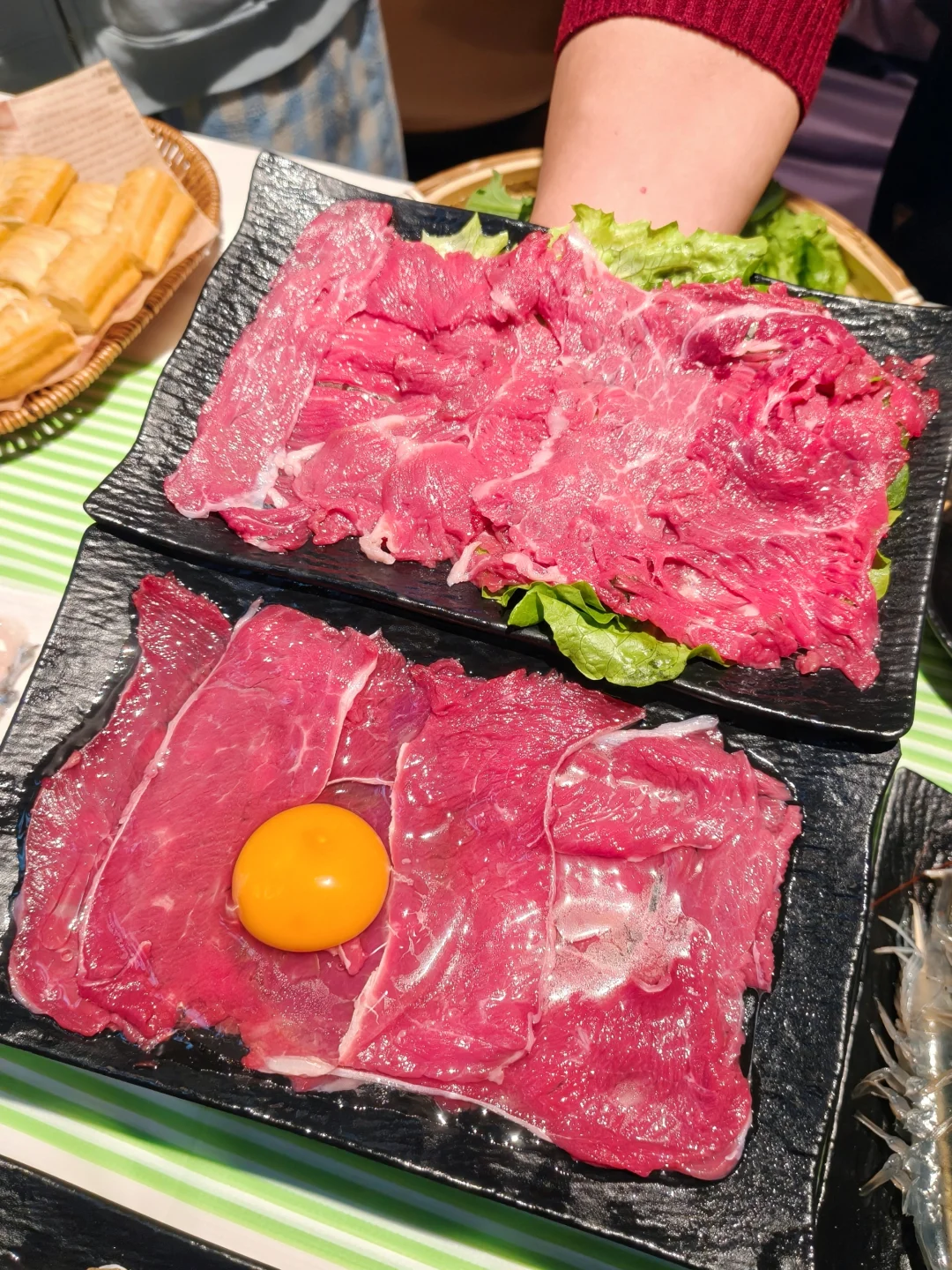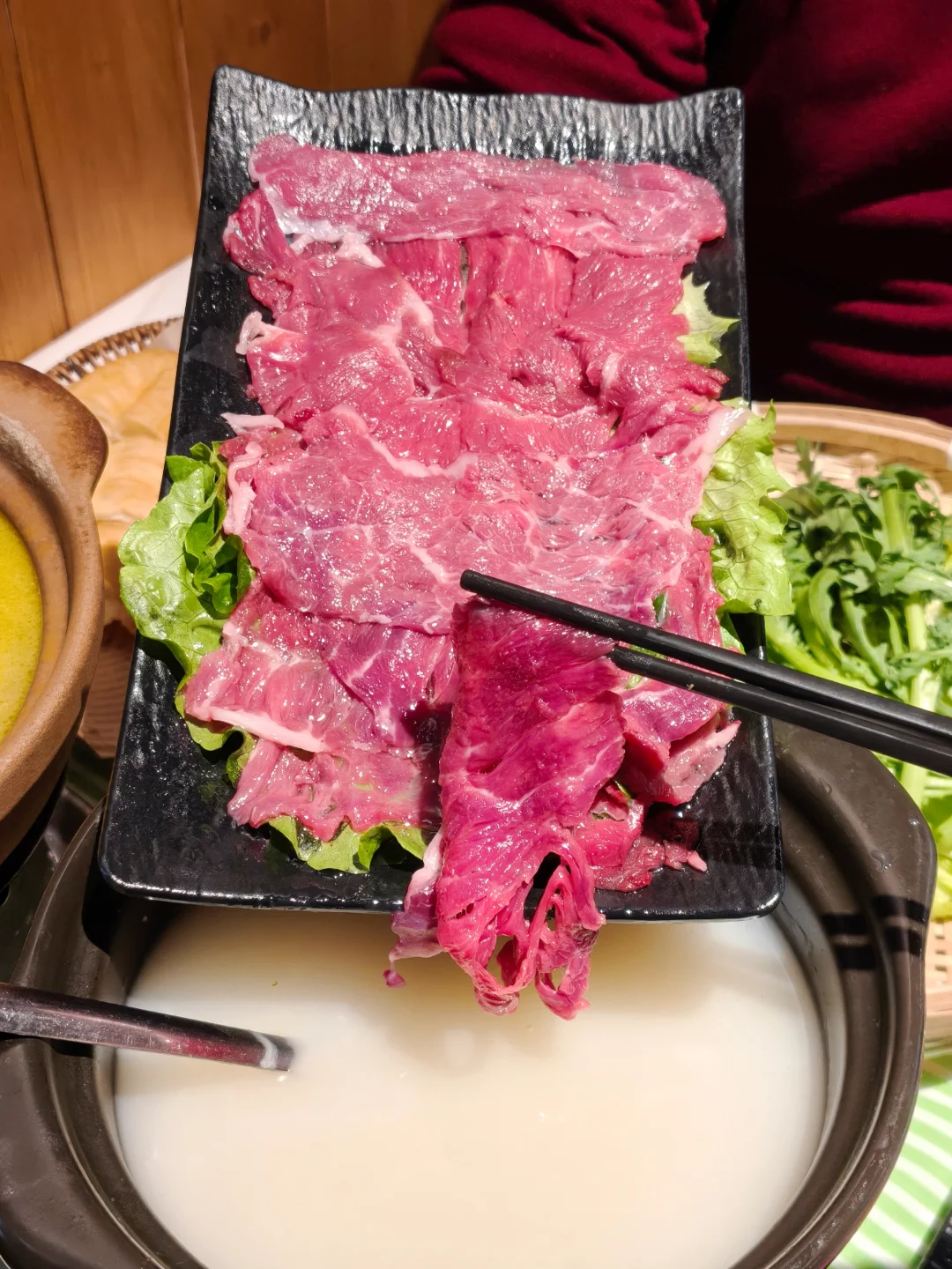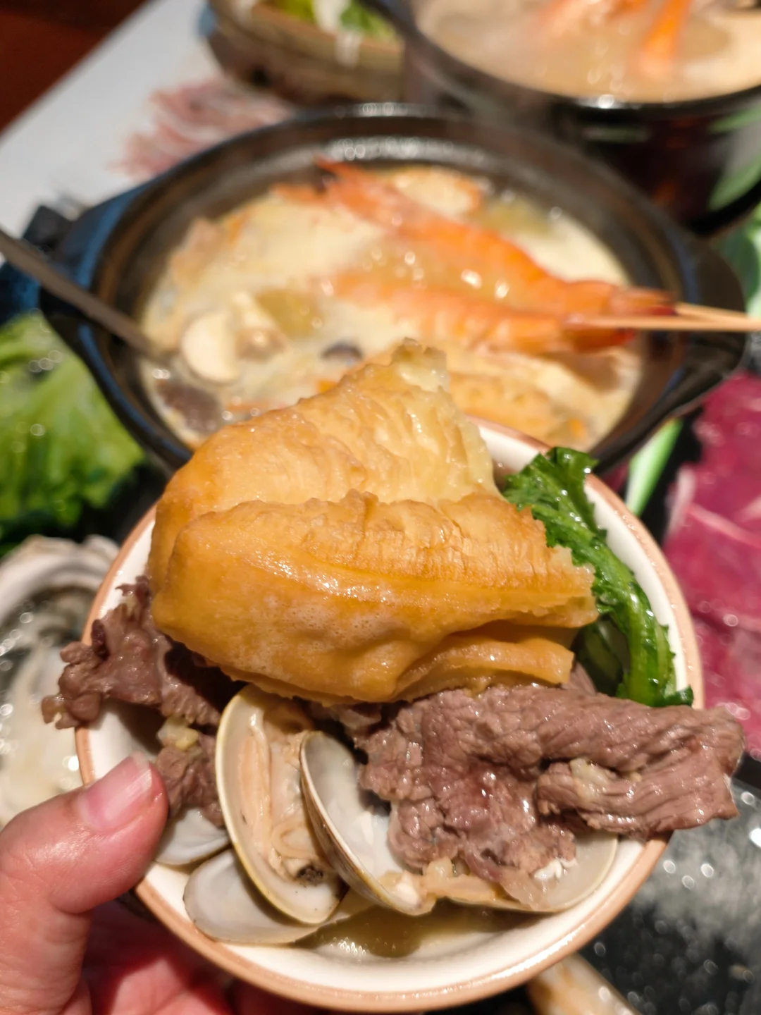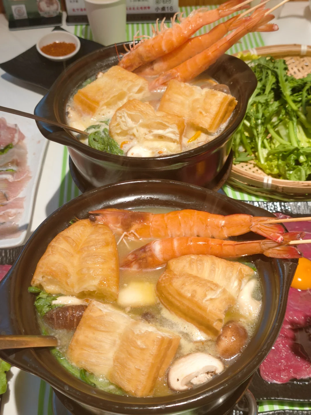 猪肚鸡锅底和粥底双拼,谁懂啊!先喝一碗胡椒味十足的猪肚鸡汤,暖胃又开胃️🔥。然后就开启涮涮模式🥘。