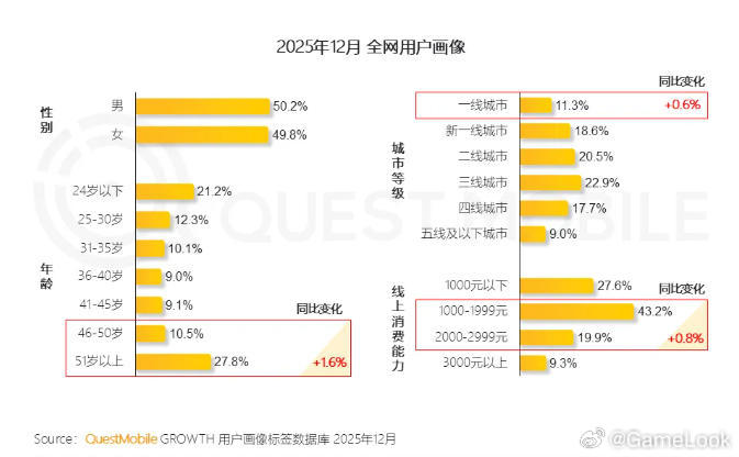【QuestMobile年度游戏报告:腾讯赢麻,TOP10 小游戏MAU均超1200万网页链接】北京时间3月10日,Quest Mobile发布了《2025中国移动互联网年度大报告》。报告显示,截止2025年12月,移动互联网月活用户规模已达到12.76亿。从用户构成上看来看,全网用户24岁以下用户占比21.2%;25至50岁用户占比51%;51岁以上用户占比27.8%。