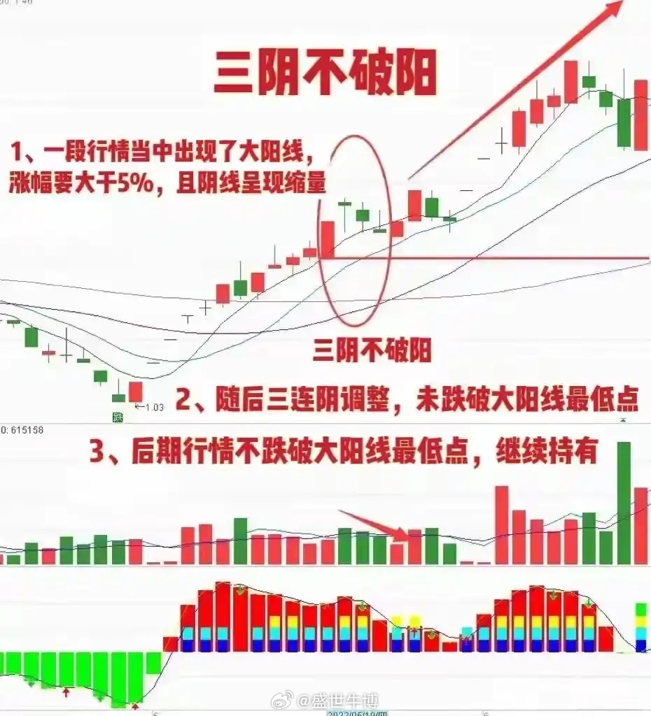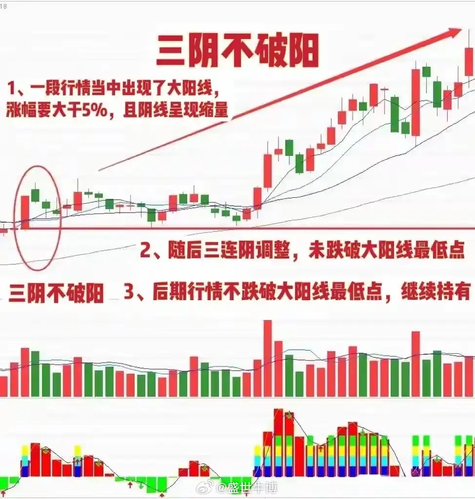 任何个股在主升浪启动后出现三阴整理,只要未跌破核心起涨阳线支撑,就是趋势未断的信号;若三阴整理后快速放量反包,立刻成为趋势强化的确认信号,后续主升浪延续的概率极高,多数趋势大牛股均符合这一形态。