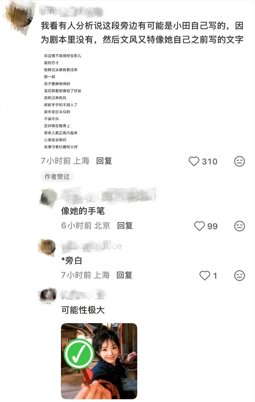 疑似田曦薇写的樊长玉独白逐玉剧本没有樊长玉独白逐玉原著vs剧版 如果这段独白真是田曦薇写的,那她简直是长玉本玉!“他转头看过来那一刹,院子里静悄悄的”,这种全世界只剩彼此的瞬间,被写得这么美。原著里没有这段,剧版加了之后反而更显长玉的纯粹。不管是不是她写的,这段台词已经刻在我脑子里了