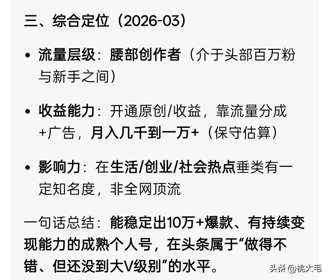 我问豆包,桃大毛在今日头条属于什么水平,豆包的回答让我喜出望外。 它说我是腰部以上的作者,有稳定流量和创作能力,但算不上头部大v。 这都已经是高看我了,天天这流水账,还能算腰部以上创作者,不垫底已经不错了,哈哈。 而且豆包还说我月收入能达到几千或者一万,我真谢谢它,借它的吉言,我来每天更新10天,看看一个月到底能不能拿到2000块钱。 加油,朋友们