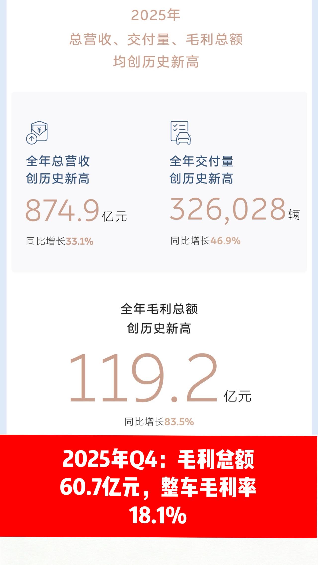 蔚来2025Q4实现盈利不出意料,但这个整车毛利真的惊到我了 就在昨天,蔚来发布了2025年第四季度及全年财报,相信大家都已经看到了。 2025年第四季度,蔚来实现经营利润12.5亿元,总营收,总销量均创历史新高。说实话我看到这并不意外,毕竟全新ES8的热爆销售摆在面前,最让我吃惊的是Q4的整车毛利率竟高达18.1%,以全新ES8迎合市场价格的销售政策,达到这个毛利率水平,显然蔚来后面是做了很多功课的,显然控新车毛利,高衍生业务比如加装件,降本增效比如采购运营将本等都做的不错,才能有这个结果。 由此可见,去年年初的公司大幅整改取得了不错的效果。从总额来看,60.7亿元,同比增长163.1%,环比增长71.7%,大幅增长的双比交出了一份完美的答卷,蔚来美股当日大涨超15%个点。蔚来乐道萤火虫三品牌该季度交付量均创历史新高。 展望未来,在毛利率这一块,蔚来CFO曲玉,在25Q4财报电话会议中也表示:今年Q1整车毛利率可保持25Q4水平;而未来的2026将有五款大SUV在售,大车毛利较高抗风险能力更强,有信心将全年毛利保持在合理水平。