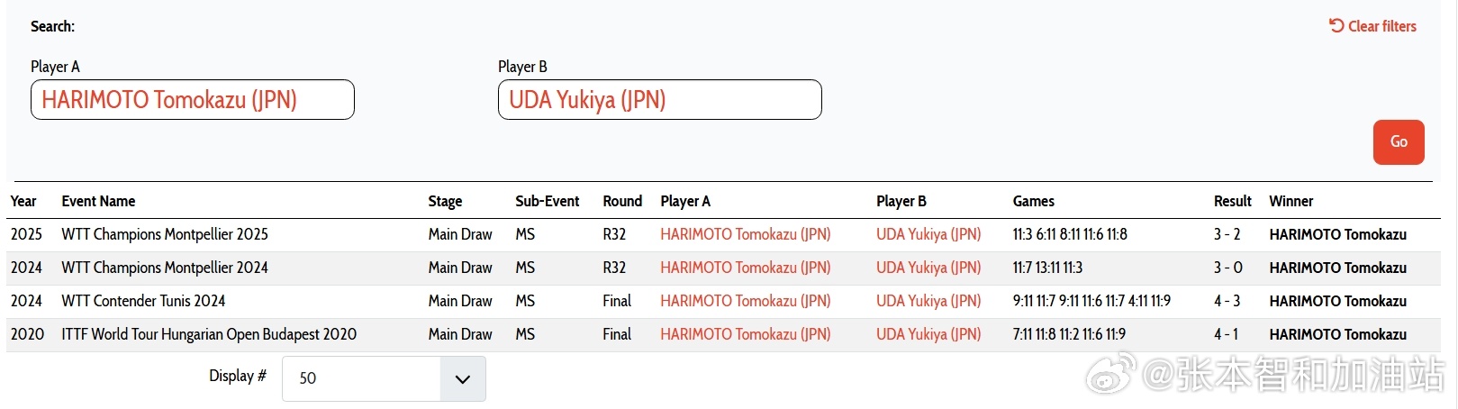 头对头记录,张本 4-0 宇田:25蒙比利埃冠军赛,3-2 (3,-6,-8,6,8);24蒙比利埃冠军赛,3-0 (7,11,3);24突尼斯常规挑战赛,4-3(-9,7,-9,6,7,-4,9);20,41。