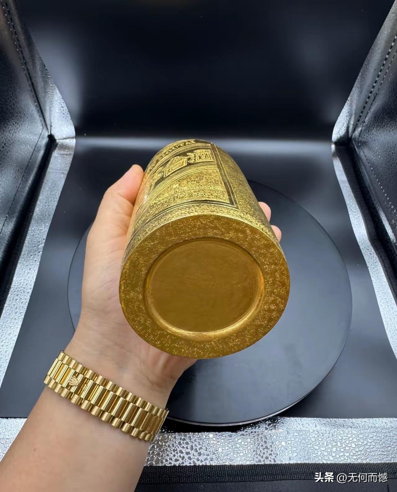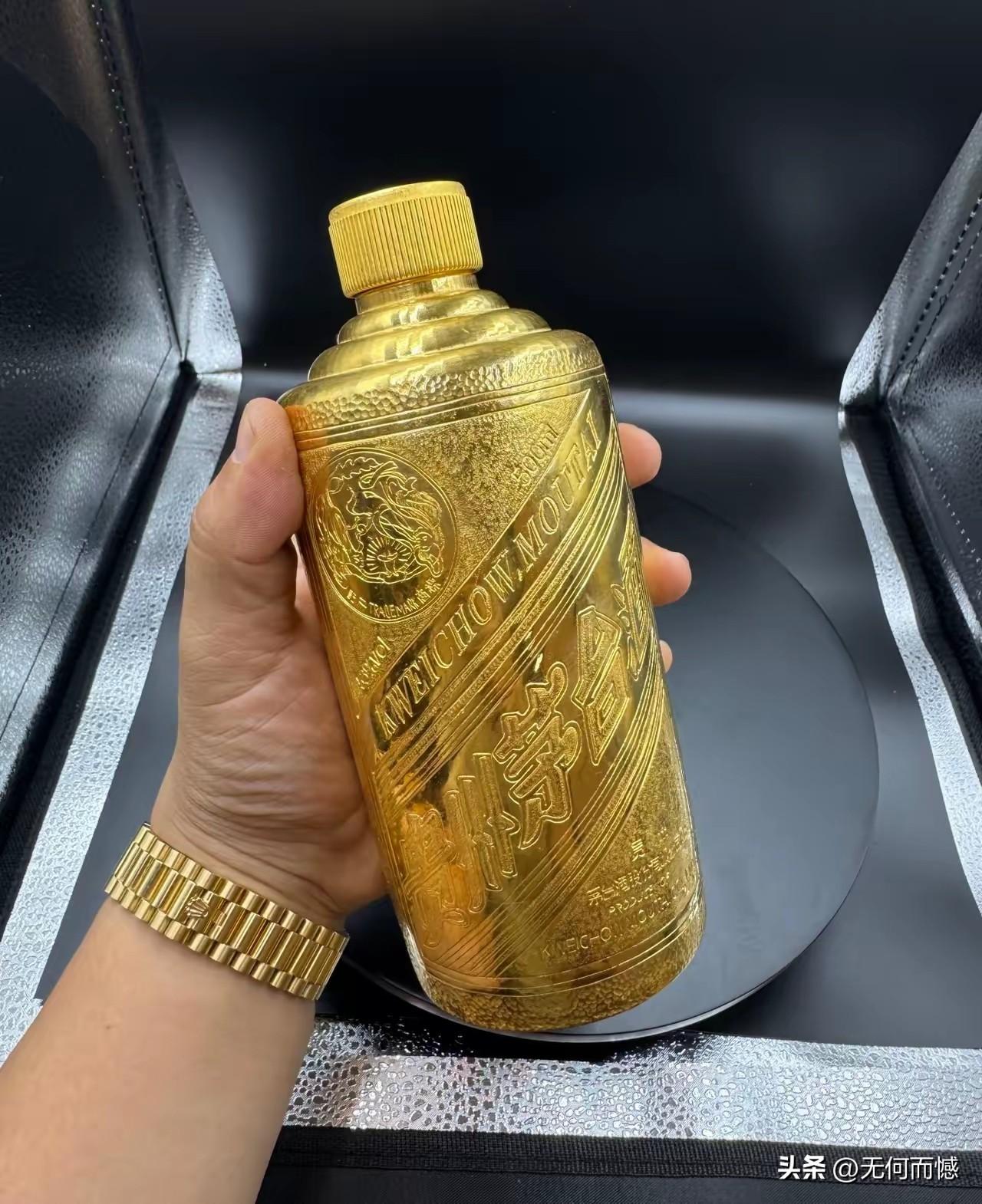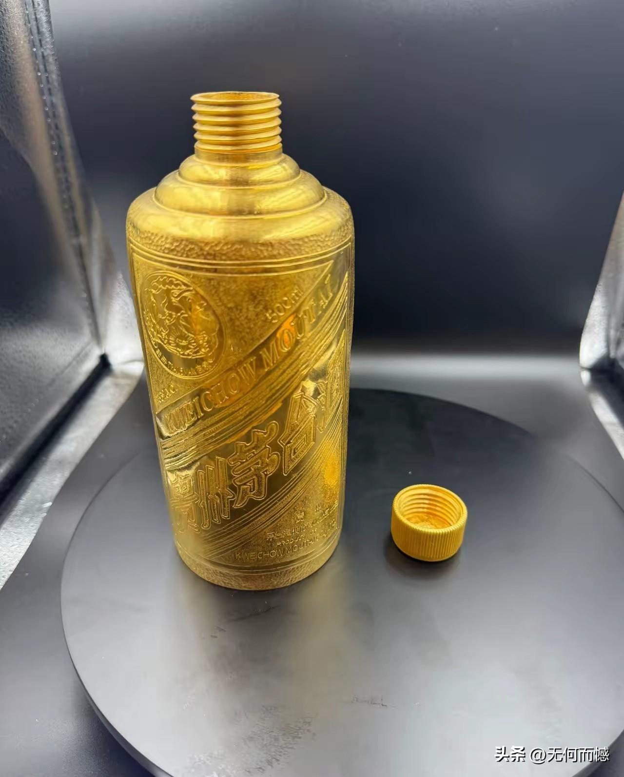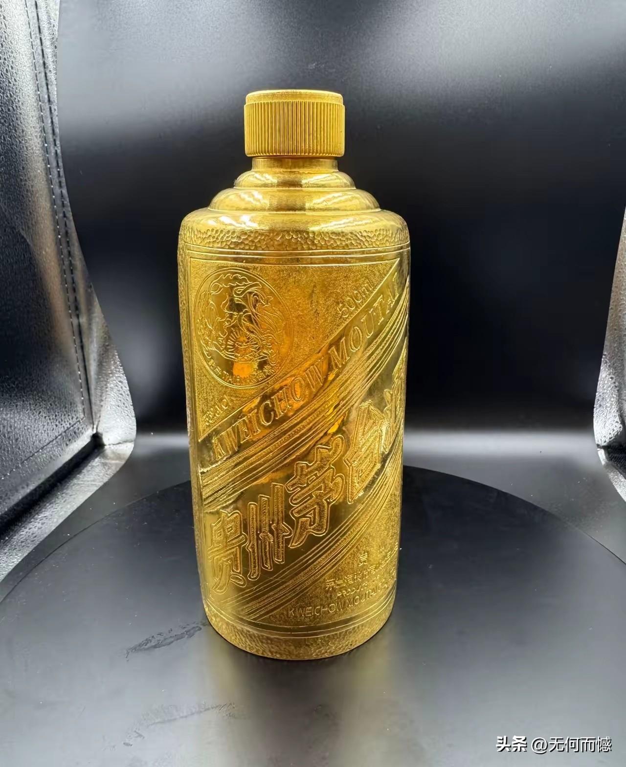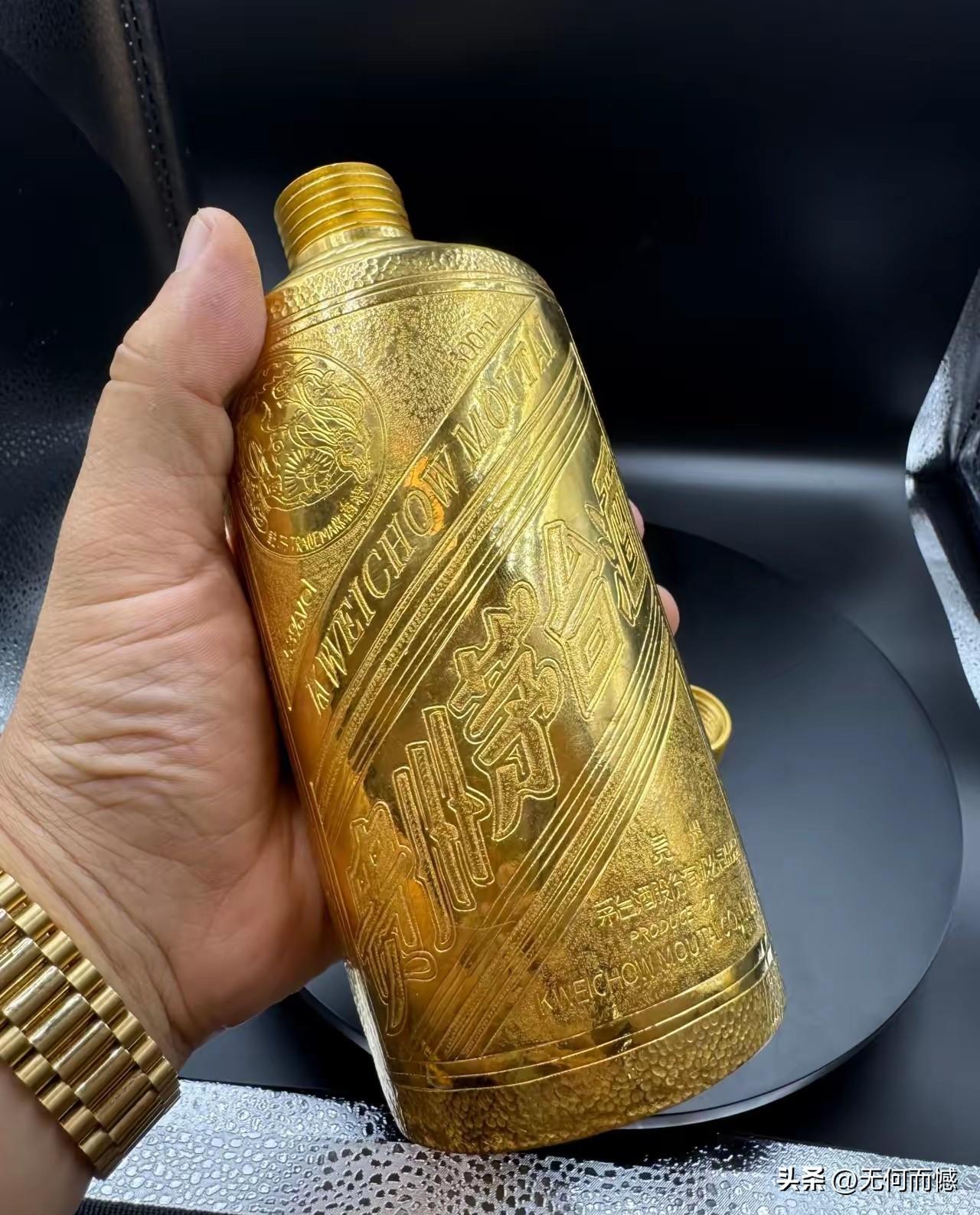 还有这样的酒瓶子,这是第一次看到,也许这是在黄金便宜的时候,厂家生产的一款酒,现在黄金涨价了,当时买这款酒的人,虽然酒的价格有些下落,但是也不会赔钱的。猜测这种酒瓶子不可能是纯金的,这要是纯金的话,得需要多少黄金啊!
