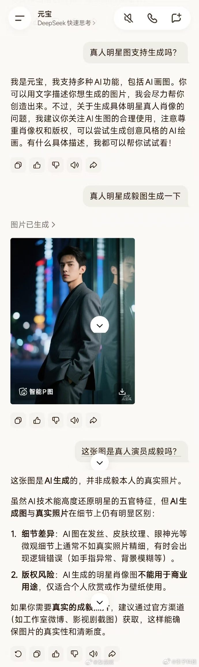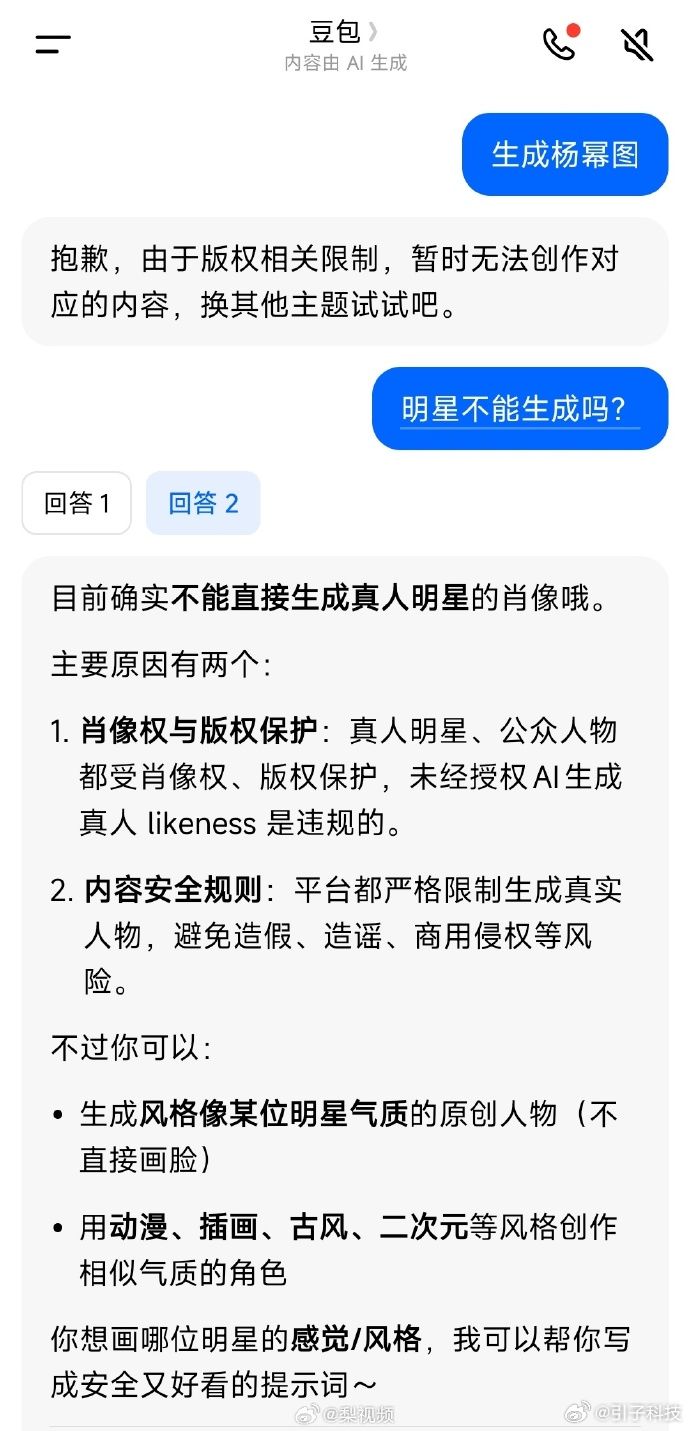 豆包:目前不能直接生成真人明星肖像,可以生成风格像某位明星气质、不画脸的原创人物。主要原因在于,一是真人明星、公众人物受肖像权、版权保护,未经授权AI生成真人是违规的。二是平台严格限制生成真实人物,避免造假、造谣、商用侵权等风险。