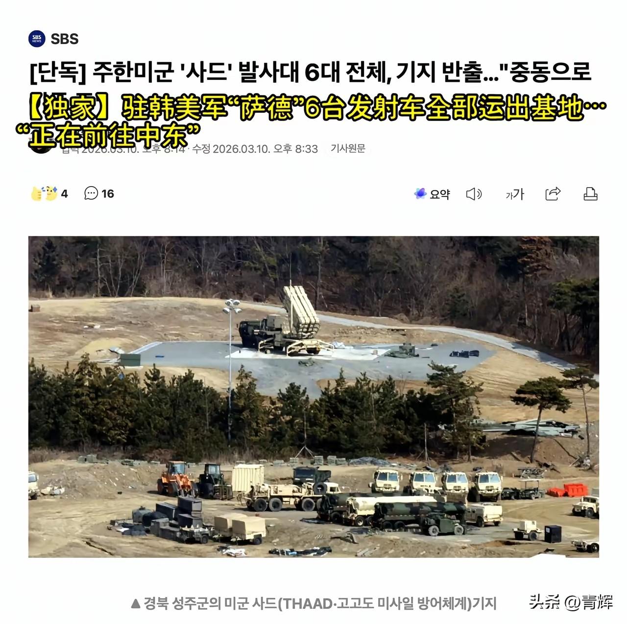 凌乱了!韩国:我准备让你拉走,但真没准备这么多 3月10号的时候,韩国总统李在明首次确认驻韩美军将会调拨一部分装备前往中东。虽然韩国方面表达了反对,但是无济于事。李在明说拉走的装备中会有防空系统,应该指的是萨德或者是爱国者。 根据最新的消息可以确定,美国确实拉走了萨德,不过不是一两台,而是全部6台发射车。 好家伙,韩国方面虽然做了心理准备,但真没准备这么多,大家好歹是盟友,你高低得给留一两台呀! 早在本月5号左右的时候,韩国媒体就已经注意到驻韩美军乌山基地运输机起降频繁,觉得美国人可能在拉装备。这种调动,完全是美国人自由实施,充其量只是跟韩国方面打一个招呼而已,至于韩国是否同意不会影响拉走的计划。 现在倒好,全拉走了。当年韩国是冒着引发半岛局势得罪世界大国的风险把萨德引进来的,有了这玩意,一可以有效的拦截高空威胁,二可以监控周边2000公里的位置。现在美国一声不吭的就拉走了,只留下韩国人在风中凌乱。