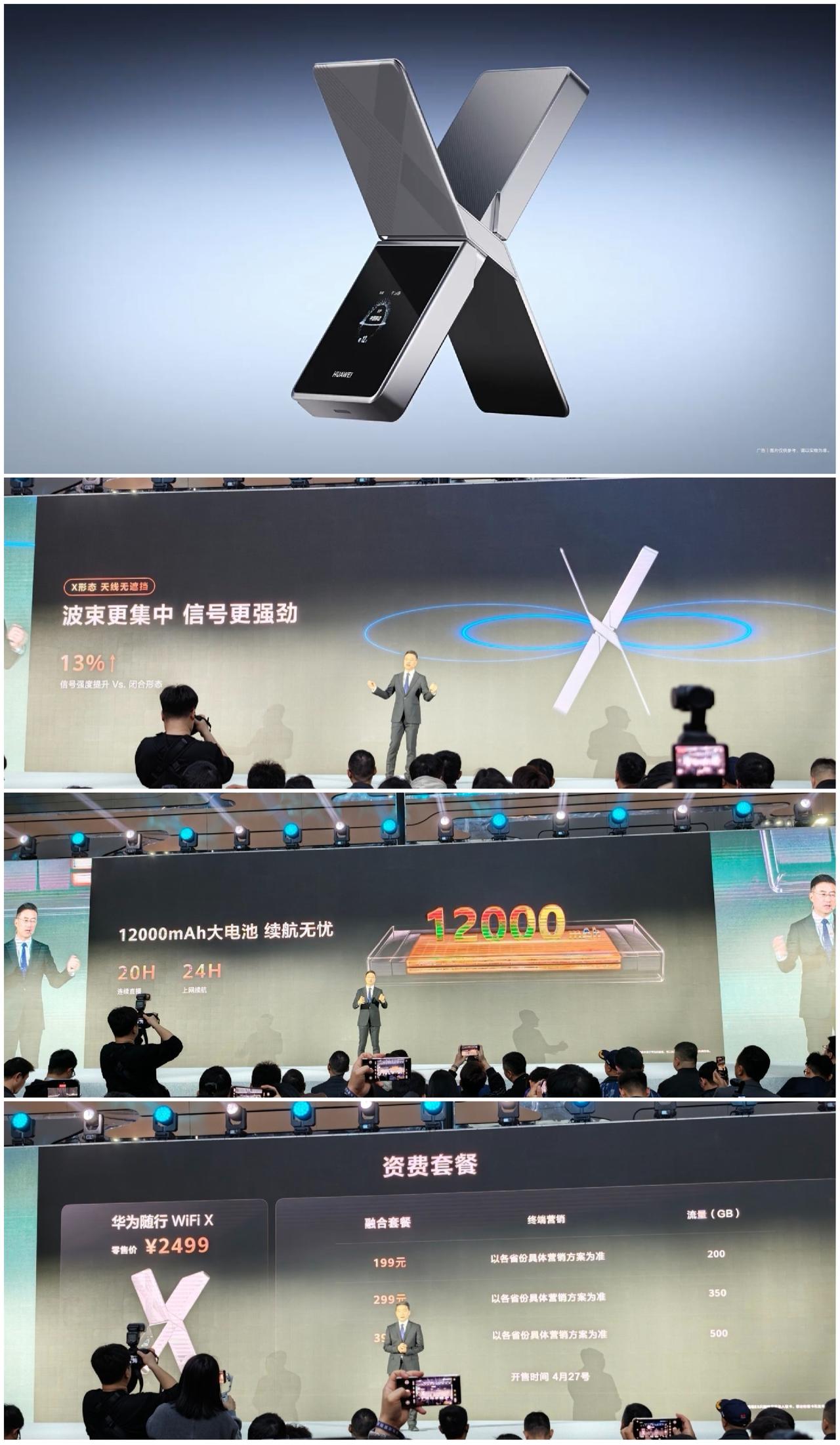 重磅消息!华为随行 WiFi X 是全球首款四发四收终端! 支持1000Mbps上行峰值速率以及5.3Gbps下行峰值速率,搭载随行 WiFi 天线系统,内置 16 根蜂窝天线 360° 收发信号,产品展开后呈 X 形态,波束更集中,信号强度提升13%。华为随行 WiFi X 还配置超大面积双层石墨烯和高导热绝缘均热膜,内置 12000mAh电池,支持连续直播20小时,或连续上网 24 小时,华为随行 WiFi X 零售价 2499元!