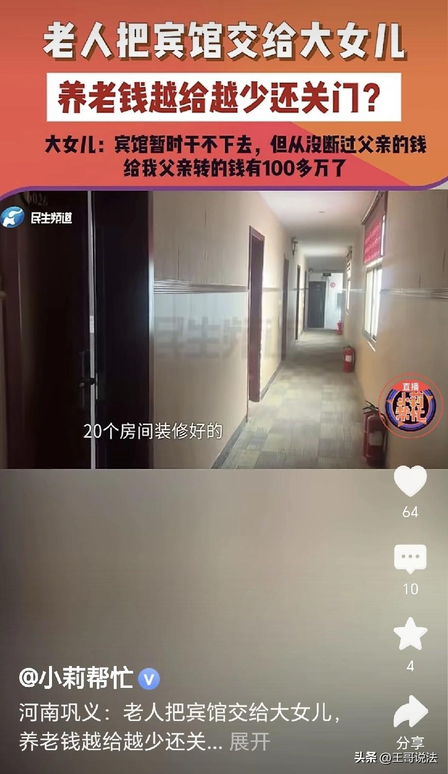 河南巩义,一男子结婚3次,离婚3次,原配生了个女儿,后妻生了两个孩子,他把5套房产给了后妻的孩子,他为了养老,建了个宾馆,可是他经营不善,这才想起来还有个大女儿,他打着补偿女儿的名义,把宾馆交给大女儿经营,他和女儿约好,女儿每月给他4000元养老,一直给到他死为止,女儿接手之后,生意兴隆,陆续给了男子100多万,可到了去年,生意一落千丈,宾馆关门,男子继续问女儿要钱,女儿急了: 你年轻时作孽,在外面养女人,我从小到大,你没管过我,你给我个烂摊子要我养你到死,你把4、5套房都给了那俩孩子,你咋不问他俩要钱?他俩也有养你的义务! 付先生年老体衰,他一个人居住,生活就靠大女儿给钱。 可最近,女儿表示,已经没钱给了,下个月她在想办法,但能不能给,她也无法确定。 付先生急了,找到媒体去讨伐女儿,他想用媒体施压,使女儿就范。 可见到了女儿,记者这才知道,完全不是付先生说的那档子事,大女儿冤枉,从小就被付先生给抛弃了。 原来,付先生年轻时挣了点钱,一时风光无限,他得意洋洋,立刻就和原配妻子离婚了。 原配生有一个女儿,从小到大他没有管过一天,他逍遥自在,离婚后又结婚,可结了不久,他又离婚,离了又结,结了又离。 最后一算,他结婚3次,离婚3次,后面的妻子,又给了他生了两个孩子。 付先生挣下了大笔的家产,他买了四五套房子,全部给了后面俩个孩子,原配的女儿他一分不给,似乎从未有过这样的孩子。 可是人算不如天算,随着时间的推移,他的年龄越来越大,可是他不甘心,又投资了100多万,建了个快捷宾馆,里面有20间房子,他精心装修,还想再挣大钱。 可是他年纪大了,经营不善,他没有精力再去管理宾馆。 他转念一想,把原配的大女儿叫来,他说他心存愧疚,要把宾馆交给大女儿经营。 他装的可怜巴巴,说这个宾馆如果大女儿不干,就谁也经营不下去了,大女儿看他可怜,答应帮他管理这个宾馆。 可是不久之后,男子要女儿给他签下协议,宾馆以40万的价格卖给女儿,女儿每个月给他4000元养老金,一直给到他死为止。 女儿接手之后,用心管理,她经营宾馆,使用了各种的方式,宾馆渐渐有了收入,生意逐渐好转了起来。 女儿不但每个月给他支付养老金,还帮他还债,几年的时间,给了他一百多万。 可谁知到了去年,生意不好做了,宾馆无人居住,生意一落千丈。 到了最后,大女儿干脆歇业关门,她十分劳累,打算把宾馆承包出去,收来的租金,可以和父亲对半分。 可男子一听就不乐意,我不管你咋整,我的4000元养老金你必须给我! 可女儿如今,两手空空,这个月已经给了,下个月的钱还不知道在哪里。 可男子不依不饶,少给一分都不可以,这时候女子发现,父亲三个孩子,可给父亲养老的只有她一个人! 而男子另外两个孩子,拿走了他四五套房子,人家俩跟没事人一样,对付先生不多看一眼。 付先生欺负大女儿老实,对着一只羊可劲了薅着羊毛,就连女儿提出,缓一下就会接着给他,他都不愿意了。 大女儿彻底急了,她指责父亲,我小时候,你从未管过我,你给我一个烂摊子,让我养你养到死! 你年轻时作孽,在外面包女人,你给你孩子留了四五套房子,你咋不去问他们要钱?他们也有养你的义务! 之后女儿还说,这个月的钱已经给他了,只是告诉他说,下个月可能就没钱给他了。 女儿这话,并不是说再不给他,而是打算想别的办法再去挣钱。 只要钱能赚来,立刻就会再给他钱,可付先生怕她不给,立刻就要和大女儿翻脸! 记者算是看明白了,的确是付先生年轻时不负责任,如今没人养他也是咎由自取! 《民法典》第1067条第二款规定:成年子女不履行赡养义务的,缺乏劳动能力或者生活困难的父母,有要求成年子女给付赡养费的权利。 在法律上来说,父亲养不养你,和你养不养他,这是两码事,不能互相抵消。 付先生没管过大女儿,确实是他不负责任,大女儿当年完全可以告他问他要抚养费。 但现在他老了,没劳动能力,生活困难,大女儿作为亲闺女,在法律上来说,必须赡养父亲,不能拿“你没养我”当借口拒绝。 但他另外两个孩子,拿了他四五套房子,同样对他有赡养义务。 这事让人特别的气愤,付先生年轻时不管女儿,老了甩烂摊子,不但偏心分财产,还道德绑架大女儿。 法律讲的是血缘和底线,只要是亲子女,养老就是法定义务,躲不掉的。 大女儿可以要求父亲另外两个孩子一起出钱,不能让她独自承担赡养义务。 法律保护老人的生存权,但也不纵容偏心的父母欺负老实孩子。 对此,你怎么看?