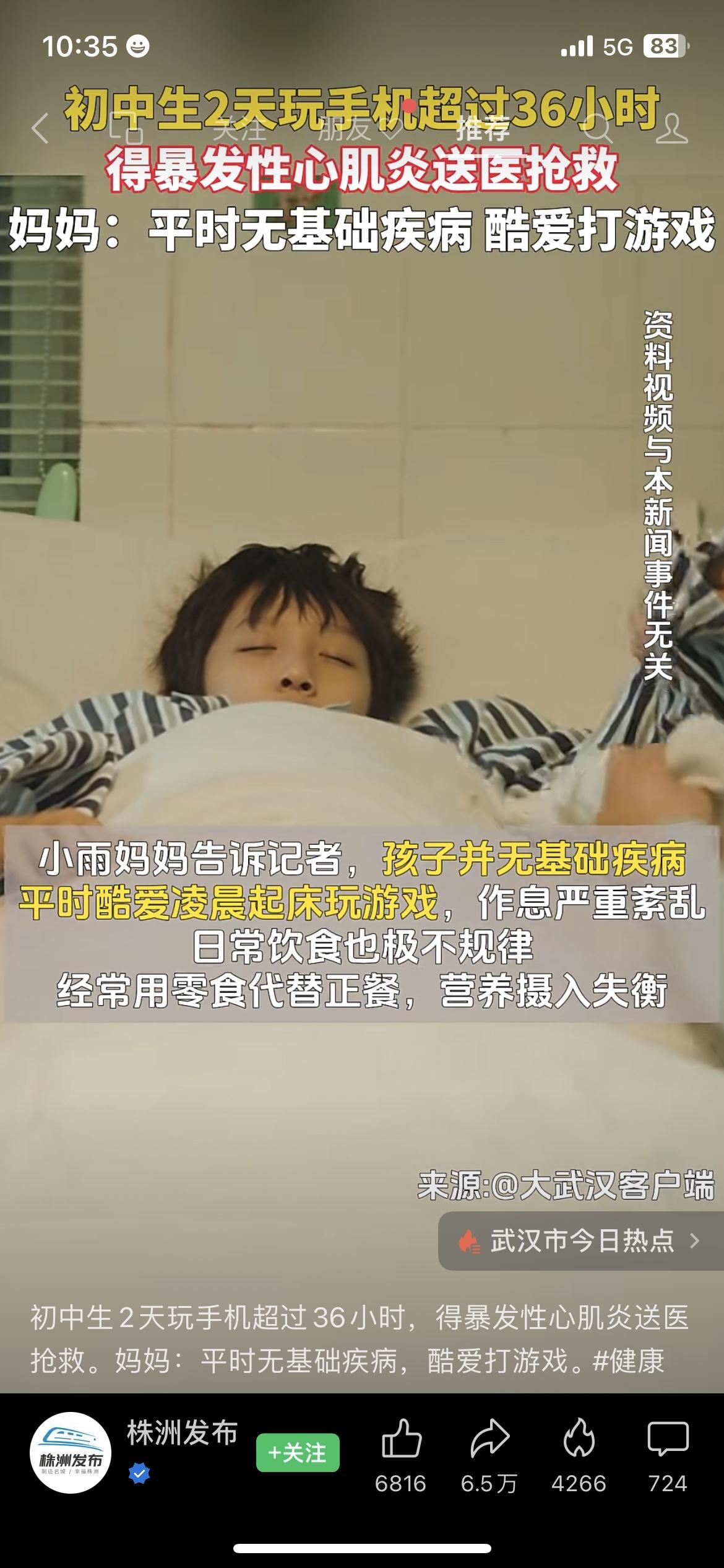 2天玩手机36小时,初中生突发暴发性心肌炎,这事真不是吓唬人 刷到这个新闻的时候,我心里咯噔一下。 武汉一个初中生,两天时间玩手机超过36小时,结果突发暴发性心肌炎,被送进ICU抢救。 他妈妈说,孩子平时没有任何基础疾病,就是酷爱打游戏,经常凌晨起床玩,作息严重紊乱,吃饭也不规律。 说白了,这不是个例。我邻居家的孩子,暑假的时候每天玩游戏到凌晨三四点,开学前直接病倒了。 这个病发作起来非常凶险,真的不能掉以轻心。 你家孩子每天玩多久手机?评论区聊聊怎么管。 青少年健康 沉迷游戏 暴发性心肌炎