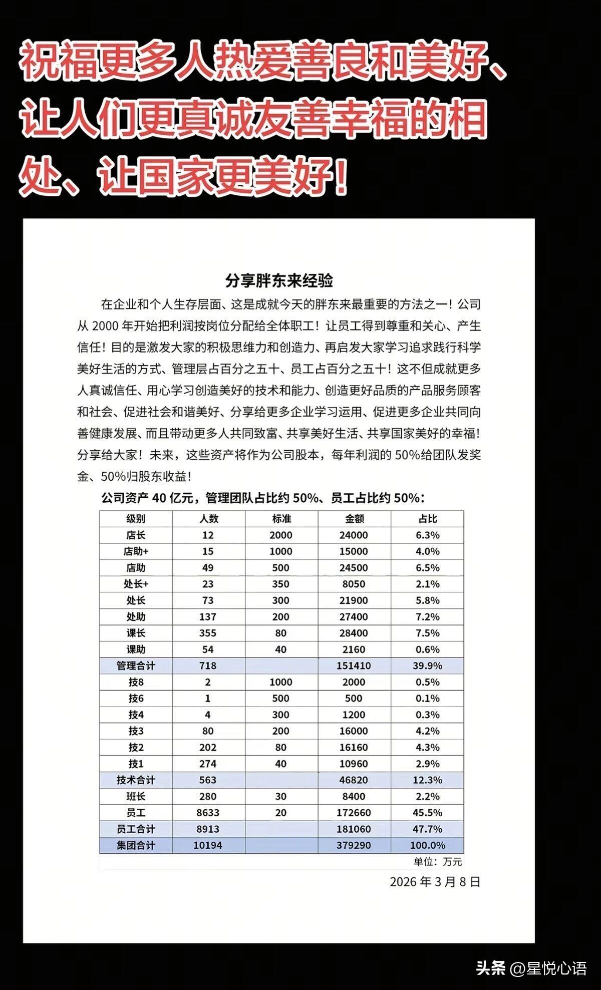 胖东来这波操作真的看呆我了! 12名店长每人分2000万,这手笔也太豪了。 关键人家不是只给高层分,全公司一万多员工都有份。普通员工人均20万资产确权,以后还能参与利润分红,这待遇真的慕了。 人家员工不仅有钱拿,福利还顶破天。 税后月均9000,年假40天起,还有10天不开心假,每天就工作7小时。 换谁不得拼命干,网友说愿意24小时待工是真的能理解。 于东来是真的把员工当家人,从2000年就开始利润共享。 把资产转股本,每年利润一半给员工,这格局真的没谁了。 其实哪是老板大方,是人家懂员工才是企业的根。员工不用为生活发愁,才会真心实意干好活,服务好顾客。 这才是良性循环,希望多些这样的企业,打工人真的太需要被尊重了! 小伙伴身边有见过这么良心的企业吗?