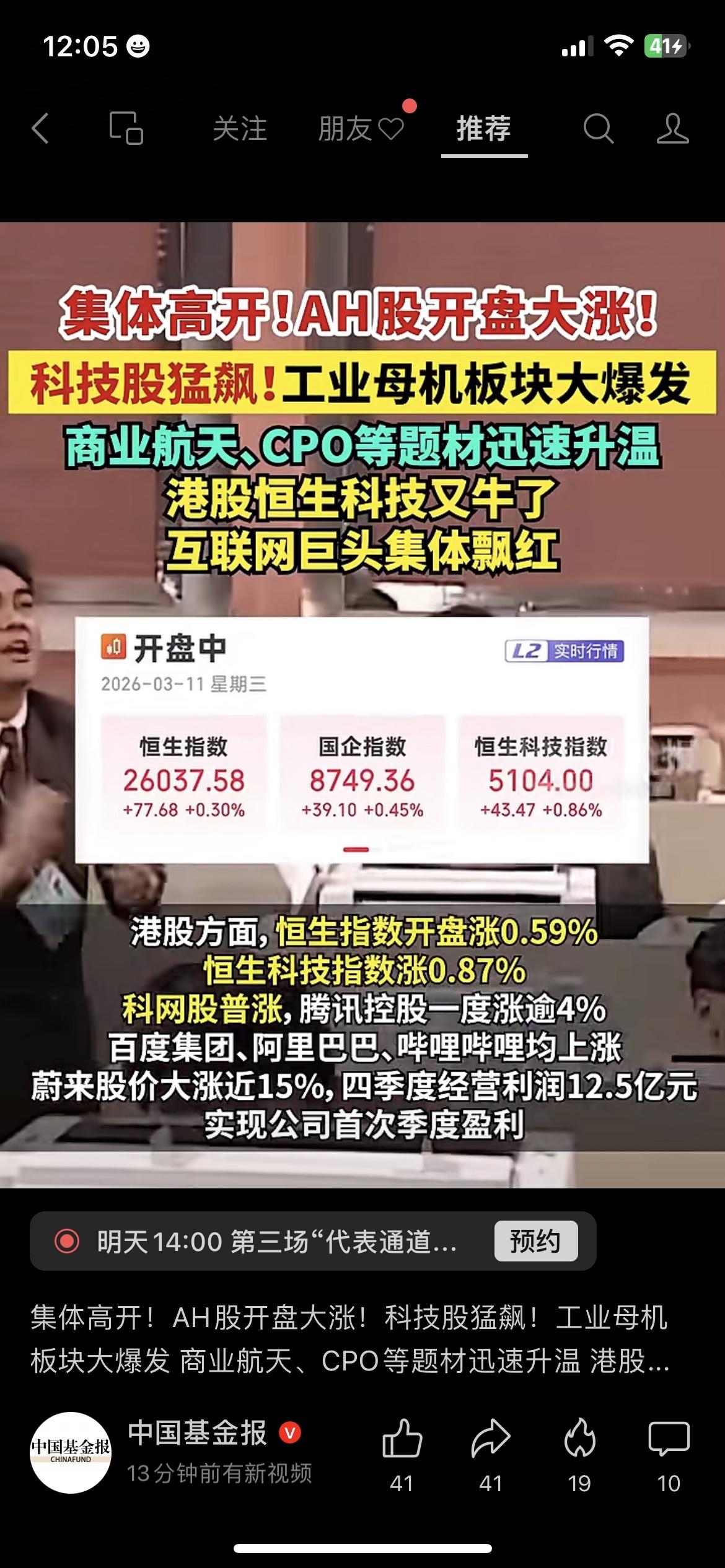 涨疯了!AH股集体高开,科技股猛飙,恒生科技涨近1%! AH股早盘集体高开!A股三大指数全线走强,港股恒生指数涨0.59%,恒生科技指数一度涨超0.87%。盘面上,科技股领涨,工业母机、商业航天、CPO等题材爆发,互联网巨头集体飘红。蔚来股价大涨近15%,首次实现季度盈利,提振市场情绪。这波上涨由科技与新能源板块利好驱动。对普通人:炒股别追高,多看少动;定投指数基金更稳;长期关注科技、新能源等政策支持赛道。市场有风险,投资需谨慎,本文不构成任何投资建议。 AH股 恒生科技 科技股 财商
