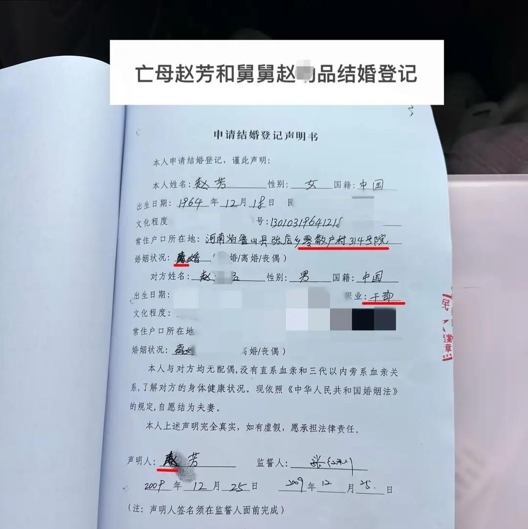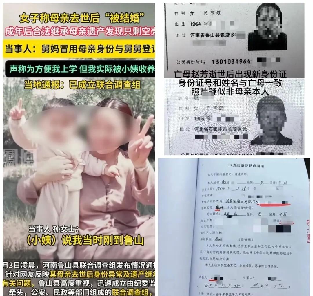 亡母“被结婚”十四天后, 公章盖在死亡证明上, 谁在替死人签字? 鲁山县民政局系统里,赵某的婚姻登记还挂着,时间显示是她死后第14天。 火化记录没有,土葬没报备,可委托书、律师见证、结婚证全齐了。 她妈2025年去世,2026年初孙女士翻老户口本才发现这事。 舅舅是县政法委副书记,当年签的监护协议,字不是她妈写的,人早就不认得笔了。 平顶山市3月9日通报说提级调查,因为鲁山县自己查不合适——人是县里的,章是县里的,连公证处都在同一个县城。 孙女士不要钱,她要立案,要查伪造证件、滥用职权,视频一条不删。 她说,妈死了,身份证不该还能“领证”。 死亡信息没同步,公安、民政、司法几家系统还是各管各的。 她妈的名字现在还挂在婚姻登记簿上,没注销,也没说法。