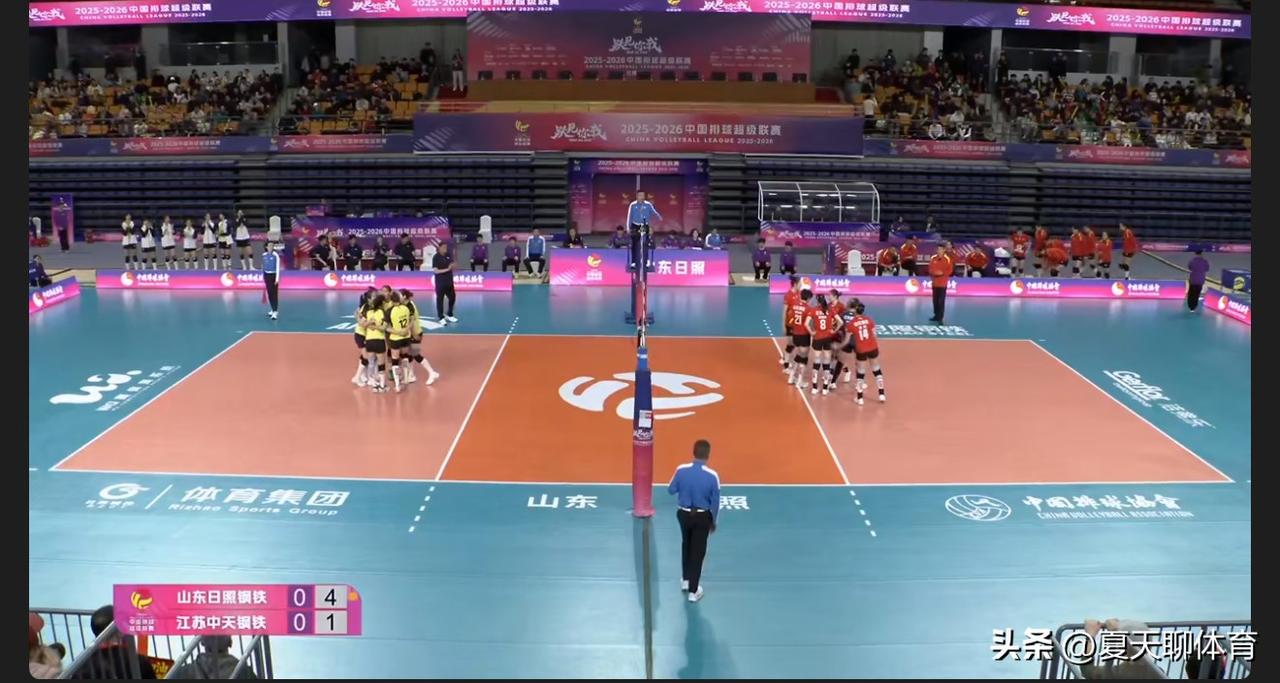 正在直播江苏女排VS山东女排!季后赛的江苏女排全胜,没有一场败绩!主场作战的山东女排能否终结江苏女排的连胜?江苏女排上一场手指受伤的主力二传张籽萱今天首发,吴梦洁、唐欣,杨佳、郭中楠,周页彤,倪非凡;山东女排这边李晨瑄、车文涵,杨涵玉、王文涵,解盛钰,孙杰,王梦洁首发。目前第一局开局,山东女排发球冲击江苏女排,开局4-1领先,江苏叫暂停!
