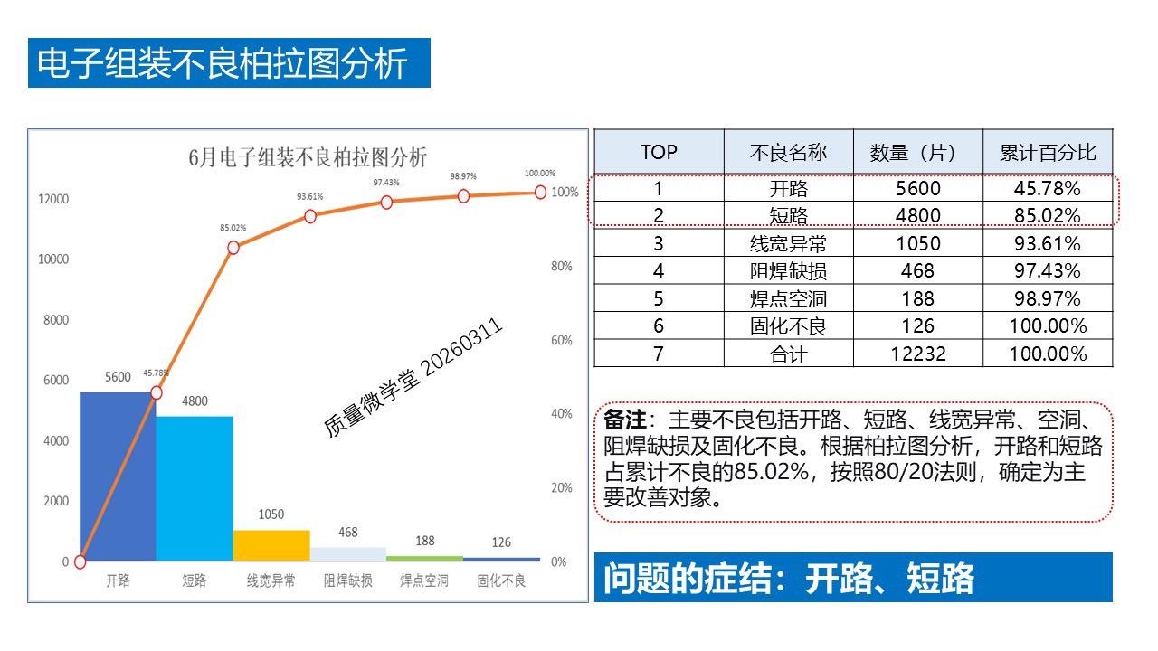 用柏拉图找出主要不良,开路短路占85%,质量改善从这里开始!质量管理 职场 品质 质量