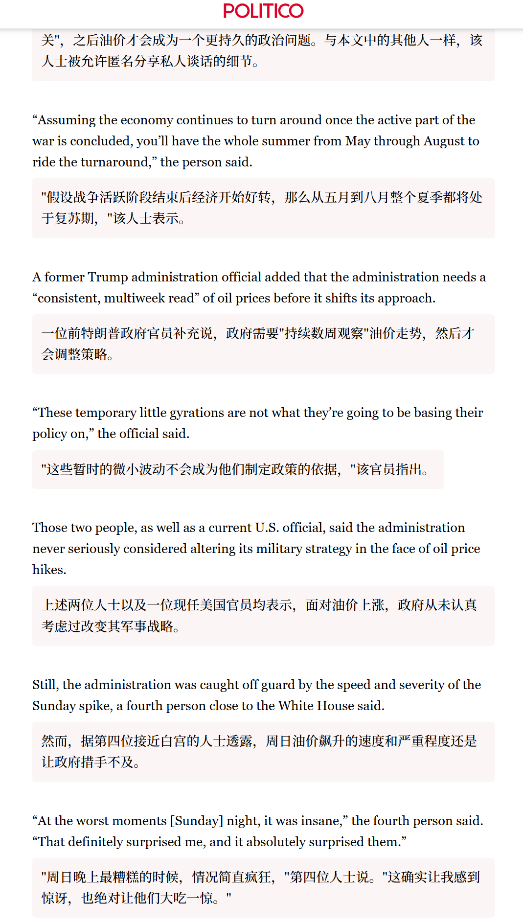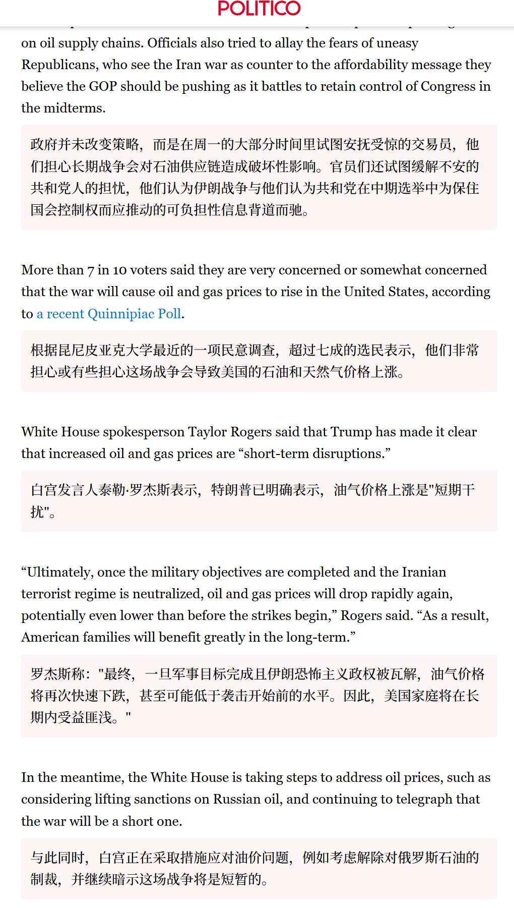 🔻POLITICO:白宫押注伊朗战争将在经济阵痛显现前结束。🔻据一位接近白宫的人士透露,特朗普政府认为,在油价成为一个更持久的政治问题之前,他们还有三到四周的时间“来应对他们需要应对的情况”。🔻白宫压根没有考虑到改变决策的问题,以至于考虑解除对俄罗斯石油的制裁,并继续暗示这场战争将是短暂的。🔻浩瀚的大洋是赌场。伊朗总统之子称最高领袖平安伊朗警告将报复美以银行目标海外新鲜事中东现场直击