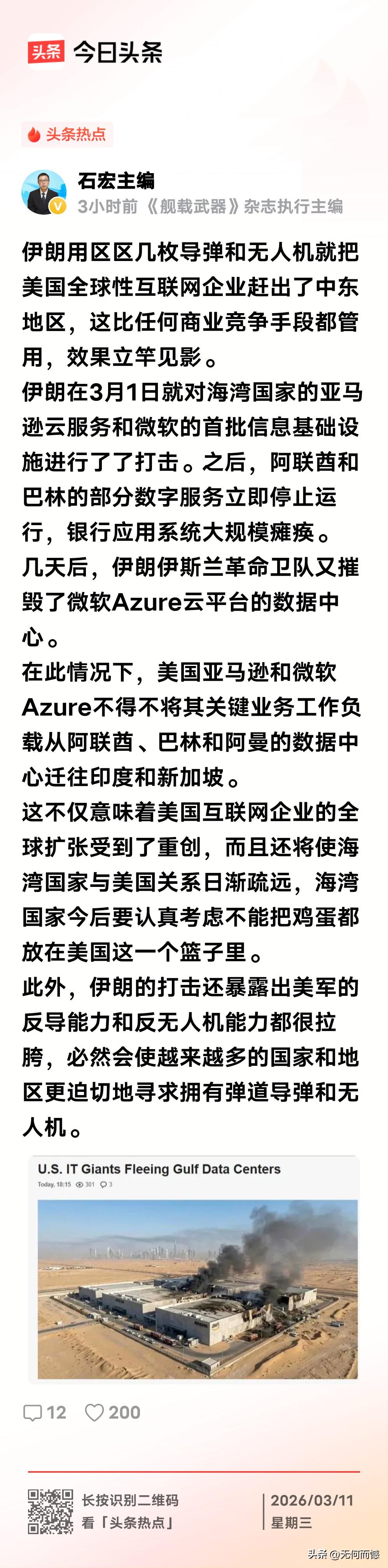 伊朗略施雕虫小技,就让全球的互联网科技巨头心惊胆寒,伊朗的代价就是用一些无人机和导弹,而高科技企业的数据中心则被炸了个稀巴烂,有的功能都已经瘫痪了,有些比较聪明的,选择直接搬走了,不敢在这里逗留了!伊朗的这个打法,打的非常高明,而且把它们真打疼了!