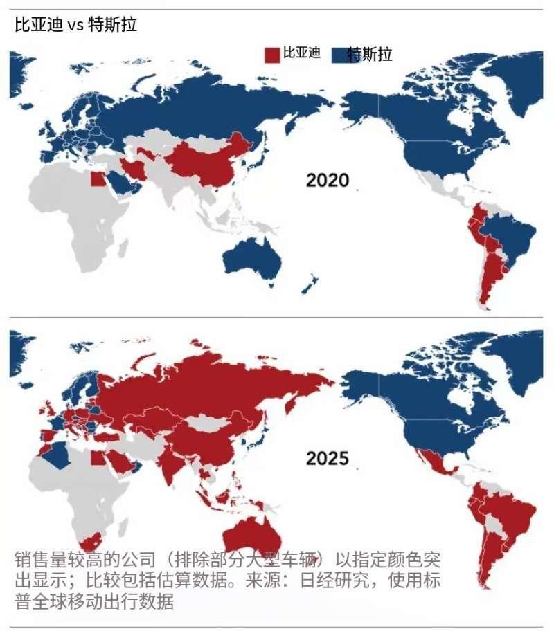 一图分析比亚迪VS特斯拉2020~2025销量分布