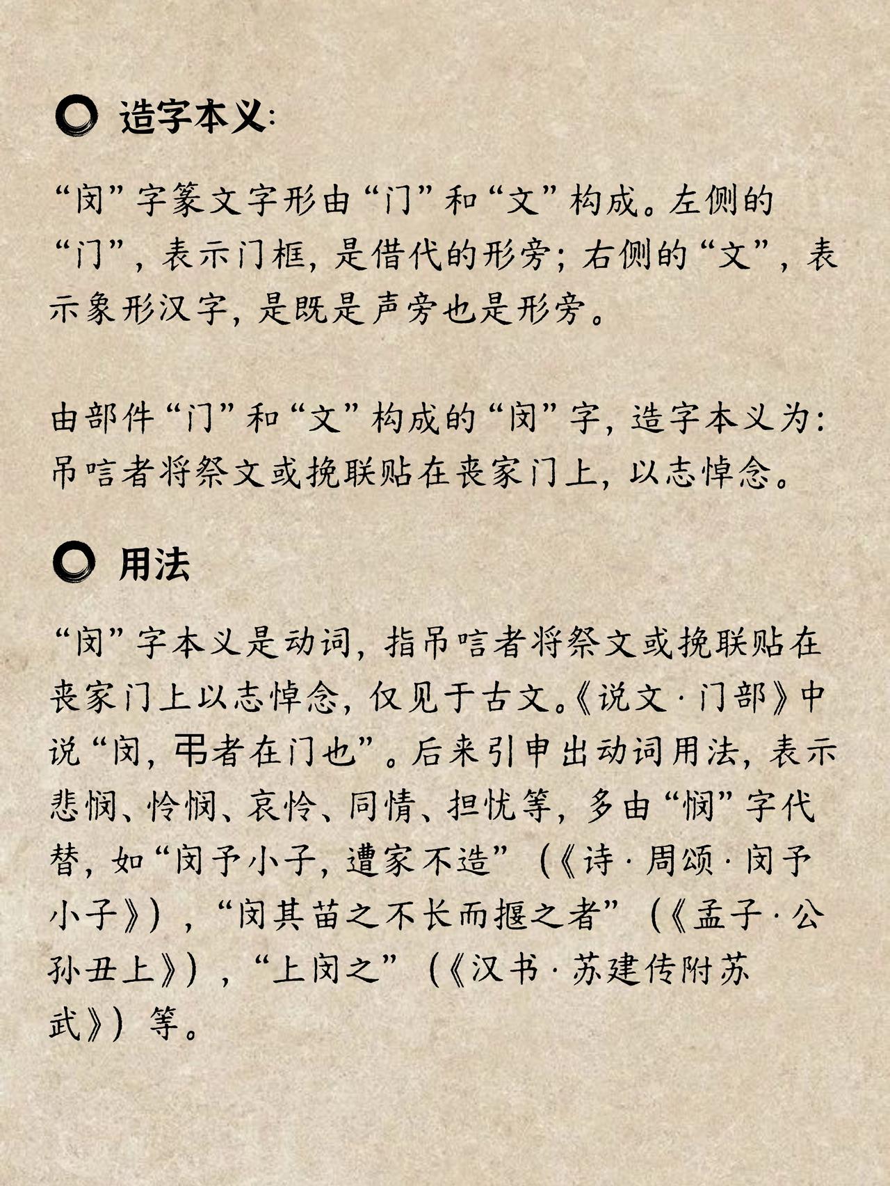 “闵”字,和“敏感”的“敏”读音一样,但意思却大相径庭,充满了悲伤的色彩。😢 在古代,交通和通讯都不发达,当亲友家中发生不幸,人们会从远方赶来吊唁。他们怀着沉痛的心情,肃立在逝者的家门口,这就是“闵”字最初的含义。🚪 “闵”的外面是一个“门”字,代表场景就发生在门口;里面的“文”,既是读音的提示,也让人联想到悼念的祭文。许慎《说文解字》说“闵,吊者在门也”,意思就是吊唁的人在门口,表达哀思。“闵”字后来引申为泛指一切的忧患和哀伤。我们现在常用的“怜悯”的“悯”,左边是一个“竖心旁”,代表用心去体会和感受这份悲痛。它和“闵”本是同源,都深藏着一份痛惜之情。