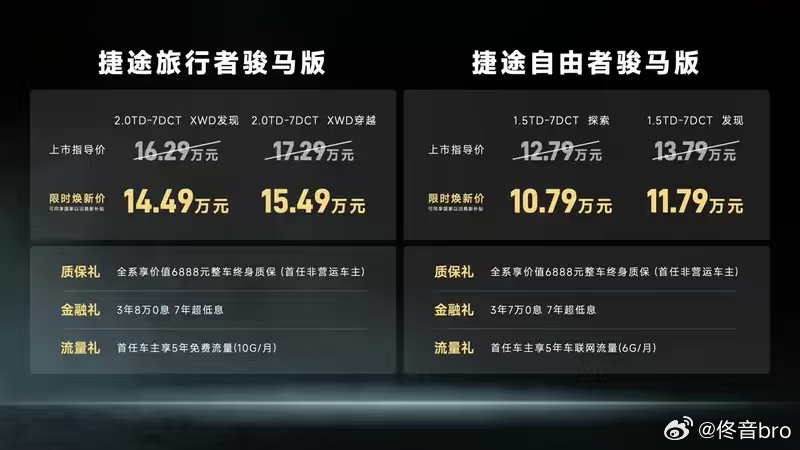 骏马捷途 捷途旅行者捷途自由者 捷途刚出的骏马版限时价,这套方盒子组合拳打得挺好:自由者骏马版(10.79-11.79万):搭载1.5T+7DCT,动力够日常通勤。花十万出头买个极具个性的方盒子外观,适合只在城市里开、但喜欢硬汉造型的颜值党。 旅行者骏马版(14.49-15.49万):升级到2.0T+7DCT,最关键是带了XWD全自动智能四驱。虽然不能去极限攀岩,但在非铺装路面和泥泞烂路上的通过能力,确实比一般城市SUV强不少。智能化也没落下,两台车都没搞以前硬派越野那种“毛坯房”内饰。标配8155芯片、15.6寸大屏、L2级智驾和540°全景影像,Carplay/Hicar也都给全了。没有过分追求极限越野那些用不上的硬核配置,保留了通过性和大空间,加上这个讨喜的造型,拉满了大v聊车