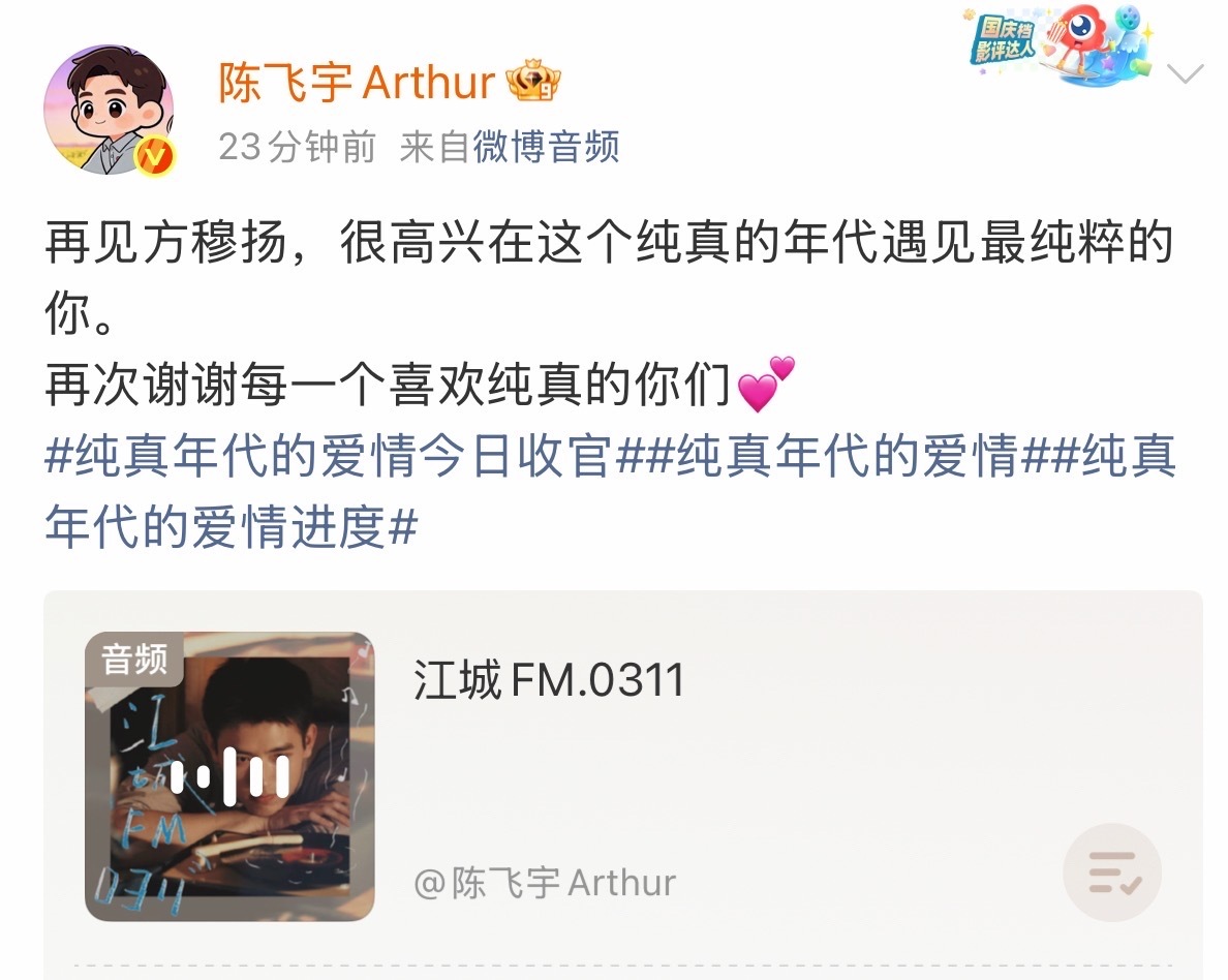陈飞宇语音电台告别方穆扬陈飞宇纯真年代的爱情收官 收官的方式有很多种,陈飞宇选了最走心的一种。自己录一段音频,把所有想说的都放在声音里