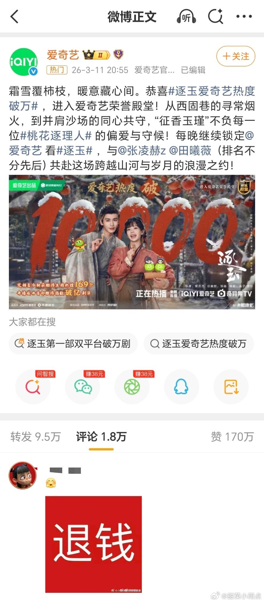 逐玉爱奇艺破万我嘞个大爆剧!🥝评论转发区全路人,粉丝都控不住了😂听说遭不住开始删评了?云包场滞销都能破万,确实很牛!🤙
