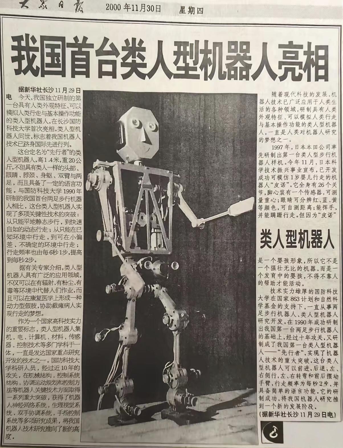 从“先行者”到宇树:中国机器人用26年,把蹒跚学步走成了世界速度🚀 很多人不知道,中国第一台类人机器人诞生在2000年。它叫“先行者”,身高1.4米,体重20公斤,骨架裸露,眼神质朴,像个刚学步的孩子——每秒只能走两步,却在国防科大实验室里,迈出了中国类人机器人的第一步。 那时候,它的“说话”带着机械电流声,挥手僵硬得像提线木偶,可正是这台朴素的机器人,让中国跻身类人机器人核心技术国家之列。 26年后,宇树机器人在春晚后空翻、跑跳,甚至扛重物、抗推搡,摔倒5秒起身,还能“看视频学动作”。从每秒2步到跑出3.3m/s世界纪录,从实验室孤品到全球量产出货第一,中国机器人用一代人的时间,把“蹒跚学步”走成了让世界侧目的“中国速度”。 有人笑先行者太简陋,像个“铁皮玩具”。可正是这台“铁皮玩具”埋下了火种:哪怕步子慢,只要敢迈,终有一天能跑起来。 今天宇树刷屏全球,都是在给2000年那个冬天挥手说“你好”的“先行者”,递上一份迟到的成绩单:前辈,我们真的跑起来了。 中国机器人发展史 先行者机器人 宇树科技