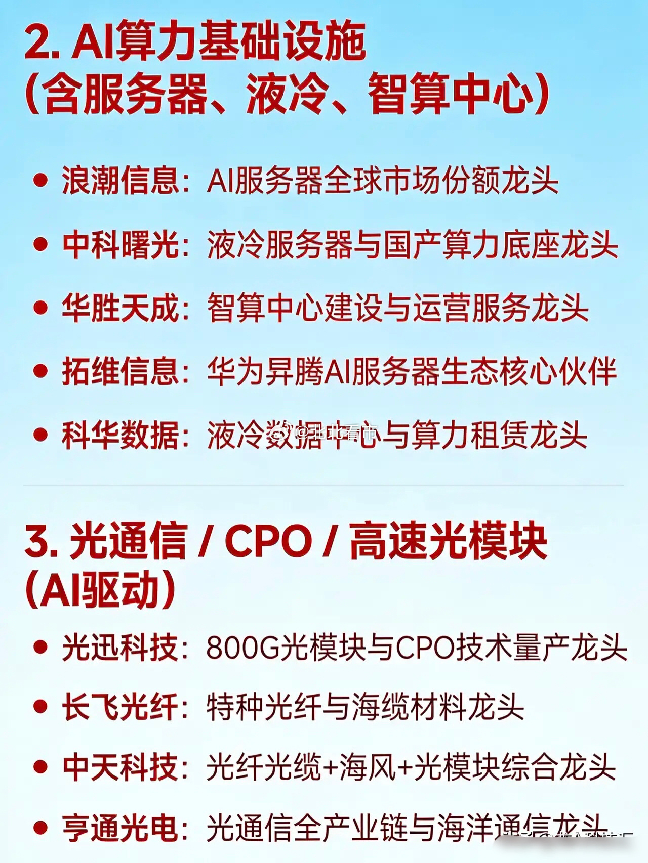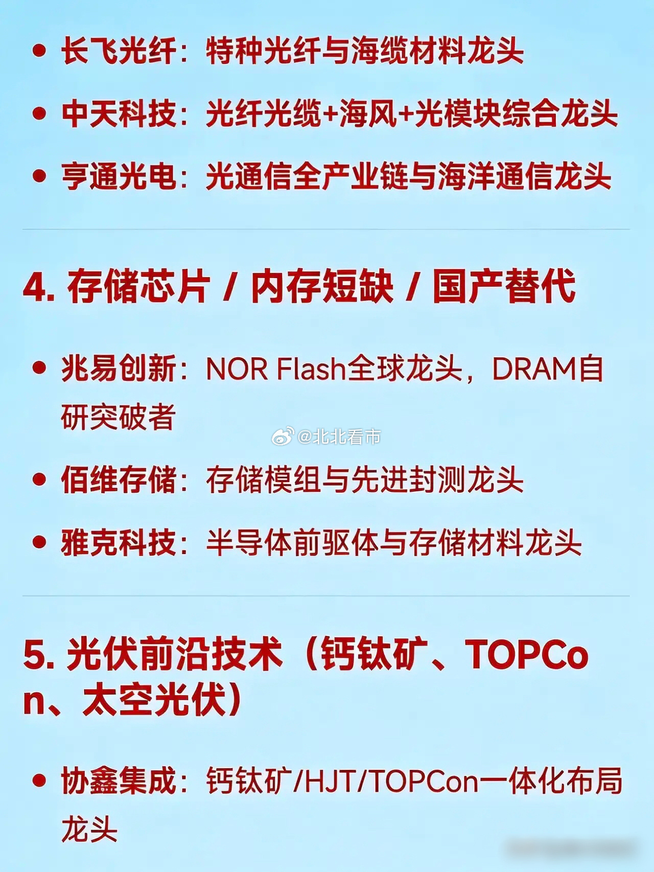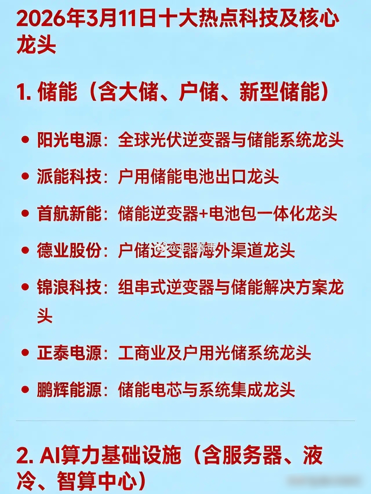 2026年3月11日十大热点科技及核心龙头1. 储能(含大储、户储、新型储能)阳光电源:全球光伏逆变器与储能系统领军企业派能科技:户用储能电池出口佼佼者首航新能:储能逆变器与电池包一体化先锋德业股份:户储逆变器海外渠道引领者锦浪科技:组串式逆变器与储能解决方案翘楚正泰电源:工商业及户用光储系统龙头企业鹏辉能源:储能电芯与系统集成先锋2. AI算力基础设施(含服务器、液冷、智算中心)浪潮信息:AI服务器全球市场份额领先者中科曙光:液冷服务器与国产算力底座领军者华胜天成:智算中心建设与运营服务先锋拓维信息:华为昇腾AI服务器生态核心伙伴科华数据:液冷数据中心与算力租赁龙头3. 光通信 / CPO / 高速光模块(AI驱动)光迅科技:800G光模块与CPO技术量产先锋长飞光纤:特种光纤与海缆材料领军者中天科技:光纤光缆+海风+光模块综合龙头亨通光电:光通信全产业链与海洋通信翘楚4. 存储芯片 / 内存短缺 / 国产替代兆易创新:NOR Flash全球龙头,DRAM自研突破者佰维存储:存储模组与先进封测先锋雅克科技:半导体前驱体与存储材料领军者5. 光伏前沿技术(钙钛矿、TOPCon、太空光伏)协鑫集成:钙钛矿/HJT/TOPCon一体化布局先锋中一科技:铜箔与电池集流体材料领军者武汉蓝电:电池测试设备细分龙头6. 商业航天 / 空天信息 / 卫星互联网中国卫通:低轨卫星运营国家队领军者航天电子:火箭/卫星电子系统配套先锋奥普光电:高精度光学遥感传感器翘楚烽火通信:6G空天地一体化传输设备龙头7. 工业母机 / 高端数控机床华东数控:重型数控机床整机制造领军者秦川机床:精密齿轮磨床与机器人关节先锋宇环数控:消费电子精密磨削设备翘楚国机精工:超硬材料+高端轴承+机床工具综合龙头8. 网络安全 / AI智能体安全(OpenClaw)中科创达:智能操作系统与AI安全平台领军者安恒信息:政企网络安全防护先锋绿盟科技:网络攻防与漏洞管理翘楚亚信安全:云与数据安全解决方案龙头9. 固态电池 / 锂电新材料天齐锂业:锂资源+低成本提锂先锋宁德时代:动力电池与固态电池研发领军者亿纬锂能:大圆柱电池与储能电芯翘楚欣旺达:消费+动力+储能全场景电池龙头10. 数据要素 / 行业高质量数据集 / AIDC光环新网:一线城市IDC资源与云计算领军者奥飞数据:粤港澳大湾区AIDC建设先锋云赛智联:城市级数据治理与腾讯生态合作翘楚石基信息:酒店/零售行业数据+小程序AI赋能龙头