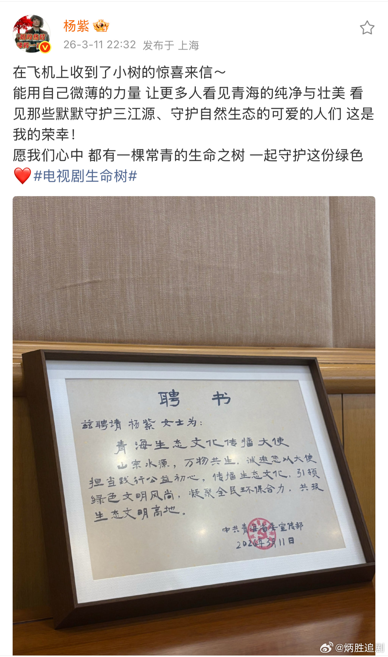 《生命树》白菊的故事已经大结局,但此外的故事还在继续,杨紫受官方聘为青海生态文化传播大使,杨紫饰演《生命树》的意义远高于参演了一部电视剧