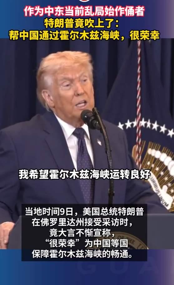 特朗普在要“人情”,说什么为中国护航霍尔木兹海峡,其实就是政治表演! 据福克斯报道,特朗普在采访中宣称,“很荣幸”为中国保障霍尔木兹海峡畅通,还直言航道对中国的利益远大于美国,一边自夸,一边暗示将与中国保持良好关系。 这番话听着冠冕堂皇,其实就是政治表现与虚伪! 贼喊捉贼!正是美以轰炸伊朗,才让霍尔木兹海峡局势骤紧,能源通道受威胁,美国非但不是守护者,反而是动荡根源。特朗普摇身一变充当“护道人”,完全是贼喊捉贼。 空头人情!嘴上说着“荣幸护航”,美军却并未对相关船只提供实质保护,所谓保障畅通,不过是一句空话。典型的只卖嘴、不做事。 绑架中国?他刻意强调航道对中国重要,就是想把中国绑上美国的中东战车,用“施恩”姿态道德绑架,为后续对华博弈增加筹码,绝非真心实意维护中方利益。 政治表演!特朗普这是在说给美国选民听,看看我多厉害,我能“掌控全局”,特朗普就是为选票服务,根本不是真正维护国际航道安全。 特朗普 霍尔木兹海峡 中东局势 国际热点