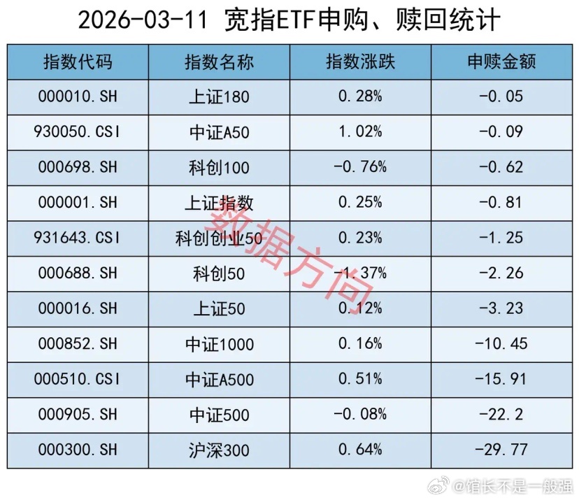 中证A500指数(-15.91亿)、中证1000指数(-10.45亿),净赎回都在10亿以上。