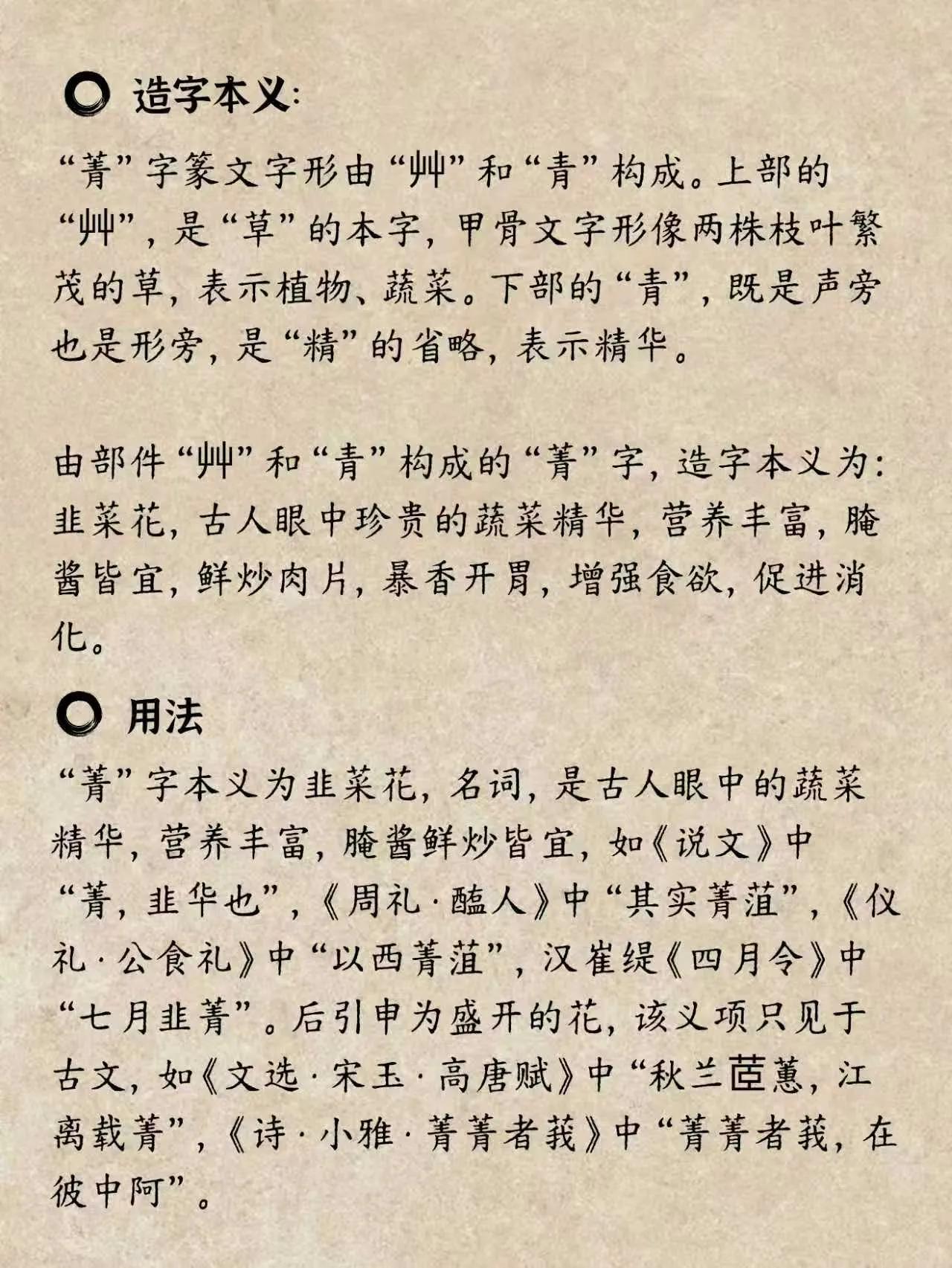 ✨“菁菁校园”里的“菁”,原来是一种能吃的花?“菁”这个字,很多人名字里都有它,但你知道它的本义是什么吗?🤔古人造这个字的时候,脑子里想的可不是什么抽象概念,而是一道美食!😋 “菁”的上面是个“艸”字头,说明它是一种植物 。下面是个“青”,不仅提供了读音 jīng,更悄悄地暗示了“精华”的“精”!所以,“菁”的本义就是——植物的精华! 具体是什么植物呢?答案是:韭菜花 !在古代,鲜嫩的韭菜花可是宝贝,无论是做成酱还是小炒,都鲜美无比。所以许慎在《说文解字》里就干脆利落地说:“菁,韭华也”,意思就是菁啊,就是韭菜的花儿 。 正是因为“菁”的本义是“植物的精华”,后来它的意义就不断扩展。我们现在常说的“菁华”,就是指事物最精华、最宝贵的部分。而“菁菁校园”这个词,一方面形容草木茂盛,另一方面也是比喻校园里汇聚了朝气蓬勃、才华横溢的学子们,他们正是未来的菁华!🎓 🧐 你身边朋友的名字里有“菁”字吗?