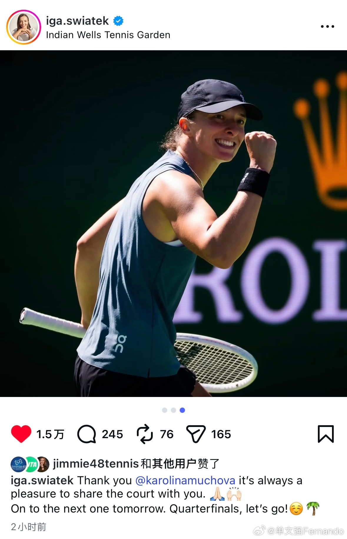 斯瓦泰克!赛后更新IG,再次表达了对穆霍娃的欣赏“谢谢Karolina,和你一起在网球场上永远是荣幸的。我要准备明天下一场比赛了,1/4决赛,加油冲☺️🌴Iga和Karolina这次印第安维尔斯开赛前就一起训练的。wta