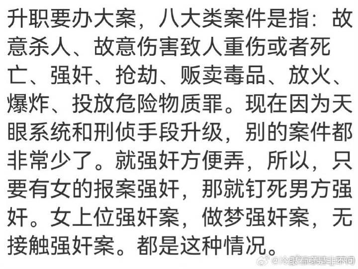 小时候受电影影响,总以为法院庭审是公诉方与辩方激烈交锋,我甚至想象到了以后大同订婚案为题材拍的电影:底线2。我甚至脑补出电影片段: 公诉方:女方八百年前微信说不婚前性行为,所以只要婚前做了艾就是强奸。 辩方:中国女人恋爱时都发过这类信息啊,你总不能指望女方说婚前可性行为,谈过恋爱的都知道,不代表情到浓时婚前也不能性行为。尤其是两人孤男寡女干柴烈火独处一室。 审判长:采纳辩方(电影),现实是不采纳 公诉方:床上有男方精斑,双方混合dna,足见强奸了。 辩方:男人床单有斑正常,混合dna确定是双方下体流出的?还是女方汗液或毛发或唾液、床上原本精斑的混合?即便是双方dna,双方开心愉快做爱也会有dna,不一定只有强奸才会留下dna。 公诉方:事后电梯监控拍到了事后拉拽,之前肯定强奸了 辩方:可事前搂抱亲热上楼了啊,事后拉拽就一定只有之前强奸才会有的独有反应吗??? 电影归电影 现实是公诉方说完,被告辩论,你辩你的,我判我的,公诉方压根不会回应辩方质疑的,法庭上各说各话,不利于判刑的统统不采纳,证据可用非亲历不可知口供,或用模棱两可的证据强判,对外宣称有证据链就行,反正大部分人又不会真的去确认证据链,就靠着一些所谓证据链,这些证据链,是把一个人当成是强奸犯以后,安在他身上或许是合理的。 但是你把他这个头衔拿掉,你会发现这些证据链一点都不合理,什么都证明不了。 铁证是什么?无论把它当成自然人还是嫌疑人这些证据放在他身上都是有效的,这叫铁证。 一些证据,他是自然人的时候就失效,他是嫌疑人的时候就有效,这叫铁证吗? 很多时候开庭前判诀书都写好了,之前就有开庭通知误寄判诀书的,庭审就是个过场,像大同订婚案二审结束不到半小时,七问七答上万字的新闻通程上百媒体同时转发, 就好比亲子鉴定,99.98相似才能算亲子,人和猪的基因*相似度也有98%,现在判强奸的证据相当于亲子鉴定中相似度68%就采用了,一个事后拉拽就能判一个人强奸。 对比去年英国报案66000起强奸,实际判刑2000多起,根据大陆2023数据,报案42000起,立案*39000起,立案率89%,判刑率99.97%,无罪率只有万分之三,2025好像无罪率又降低到万分之二了,很多法官一辈子都审不到一起无罪, 相当于只要立案了,9成是要判强奸的,区别是不是要坐牢,很多判缓刑+不用坐牢的强奸,一告一个准失毫不夸张,小道消息数据,中国这几年每年判刑的强奸犯是全世界一半多,是美国的20倍,印度的4倍,而且中国强奸犯只判男,其他国家男女平等,强奸犯男女都判, 前些天看新闻,三女强奸一个男的,男的都被干废了,每个女的只赔了800块,而男女互换,这是大案了,轮奸,都是十年起步判刑男方。