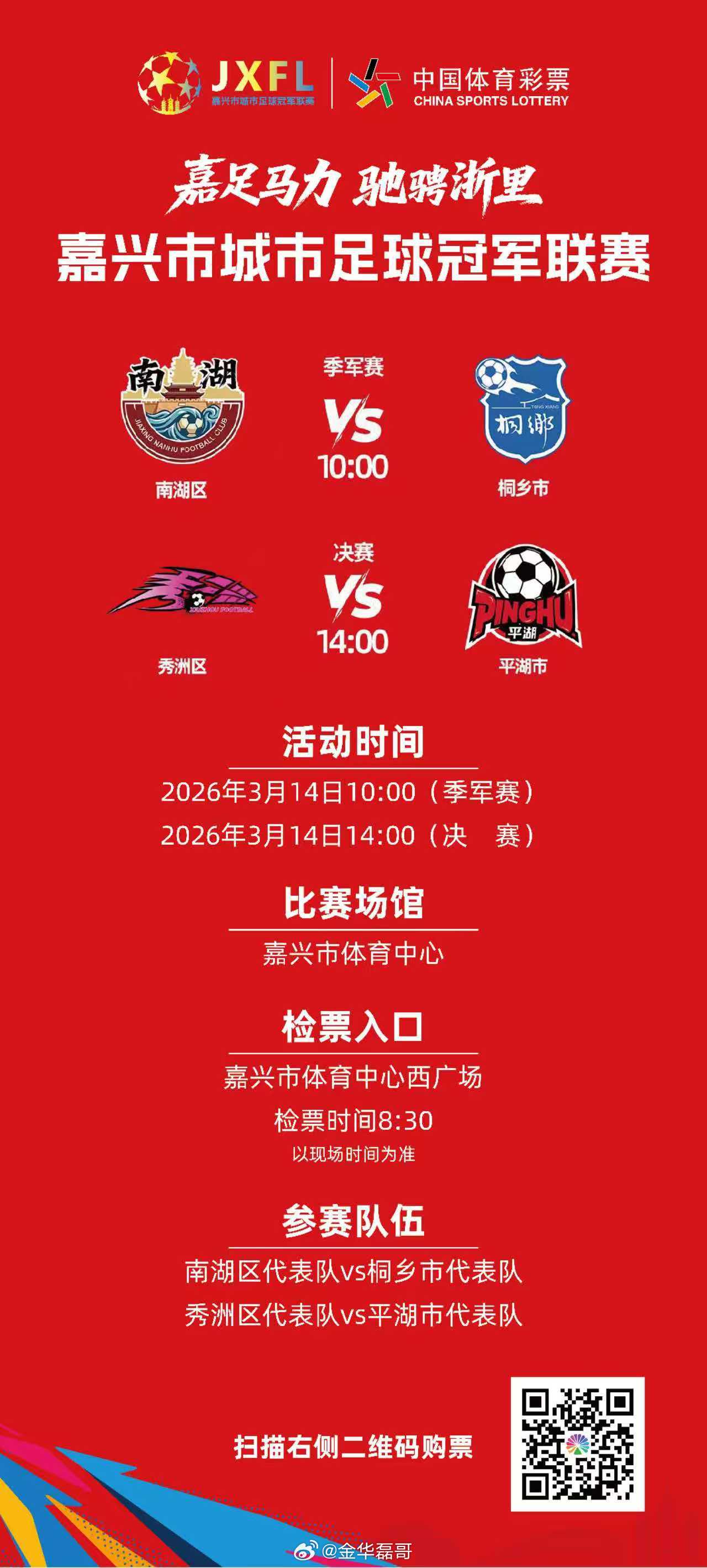【最是江南好风景的嘉兴燃起足球的激情!】这个周末赴嘉兴足球王者之战三月的嘉兴,不只有小桥流水,还有绿茵场上的呐喊。这个周六(3月14日),嘉兴四支本土球队,在嘉冠联赛的决赛日狭路相逢——上午10时南湖和桐乡的季军战,下午2时秀洲和平湖的冠军战,一起见证一个问题:嘉兴足球,谁能封王?3月14日,来现场,看水乡的另一面。在水乡嘉兴期待一场热血的足球