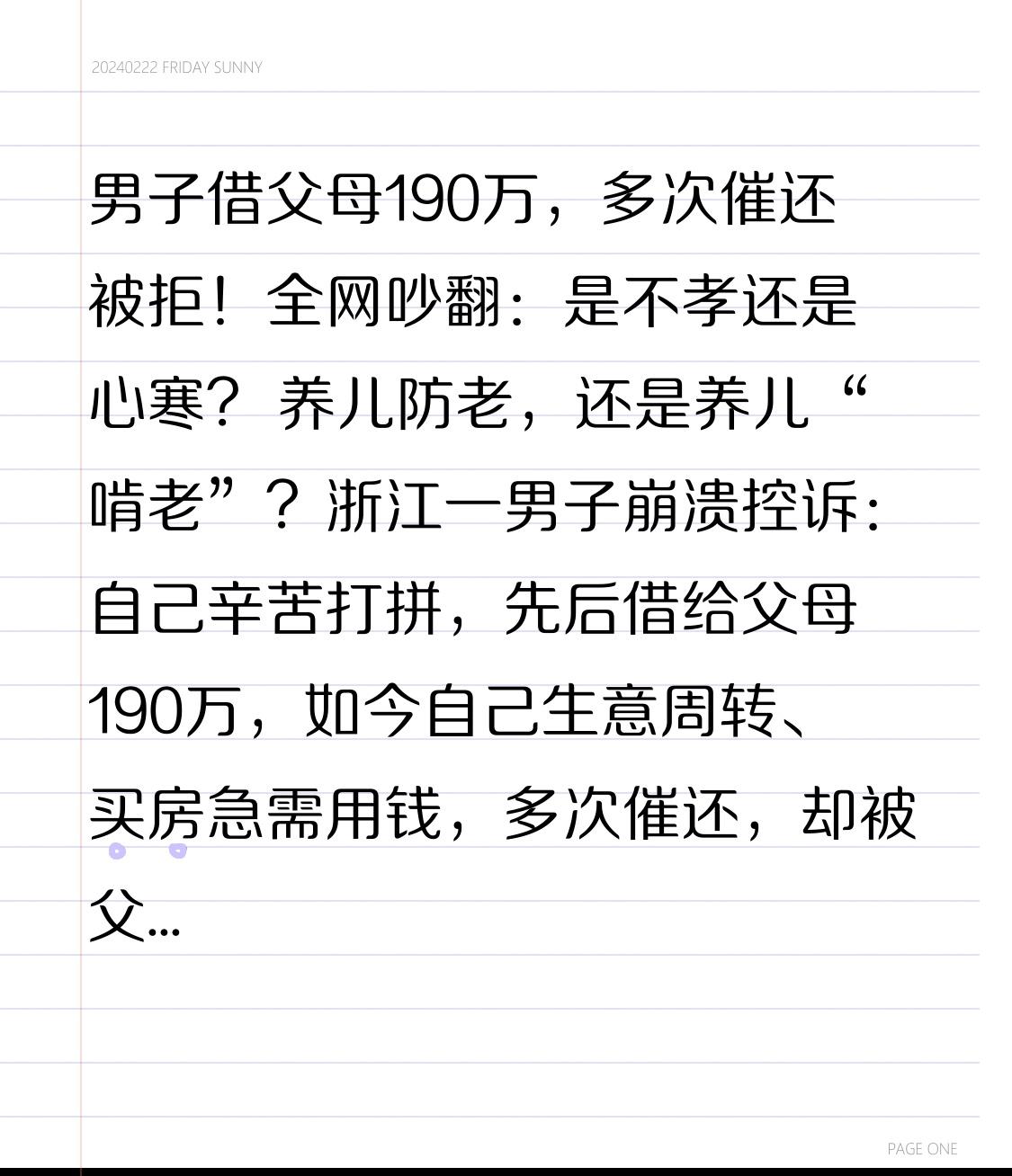 男子借父母190万,多次催还被拒!全网吵翻:是不孝还是心寒? 养儿防老,还是养儿“啃老”?浙江一男子崩溃控诉:自己辛苦打拼,先后借给父母190万,如今自己生意周转、买房急需用钱,多次催还,却被父母一口拒绝,甚至骂他“不孝、白眼狼”! 视频一出,全网吵翻!有人骂他冷血,有人替他委屈,190万的亲情账,到底该怎么算? 一开始,很多人站父母:“父母养你这么大,借点钱怎么了?催债就是不孝!” 可随着男子晒出转账记录、聊天记录,真相彻底反转,所有人都沉默了。 这190万,不是男子主动给的赡养费,全是父母一次次开口借的:帮弟弟买房、给弟弟买车、给家里盖新房、还弟弟的外债……男子念及亲情,一次次掏空积蓄,甚至贷款凑钱,前后累计190万。 如今男子生意亏损,房贷压身,孩子要上学,走投无路找父母要钱,父母不仅不还,反而指责他“眼里只有钱,不顾亲情”,弟弟更是躲着不见,觉得哥哥帮家里是应该的。 更扎心的是,父母拿着他的钱,给弟弟全款买房买车,自己却住着老房子,省吃俭用,父母的偏心、弟弟的理所当然,彻底寒了他的心。 原来,不是他不孝,是亲情被偏心消耗,善良被当成理所当然;不是他冷血,是190万背后,是一个普通男人的无奈与绝望。 亲情最伤人的,从来不是没钱,而是偏心与不公。 父母总说“手心手背都是肉”,可现实里,总有孩子被偏爱,总有孩子被牺牲。 帮父母是情分,不是本分;借钱是心意,不是义务。 别让偏心,寒了懂事孩子的心;别让亲情,变成无休止的索取。 愿所有父母都能一碗水端平,愿所有付出都能被珍惜,愿亲情里,没有算计,只有真心。 你觉得男子催还190万,错了吗?评论区说说你的看法!